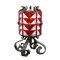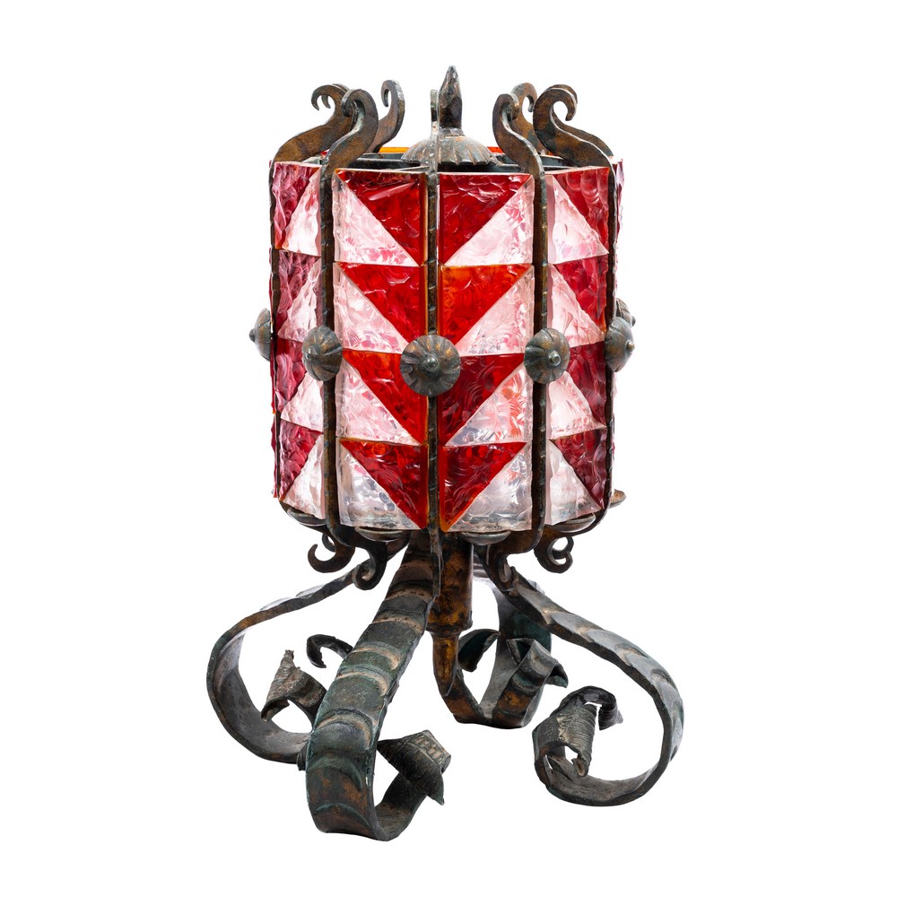 Lampada in ferro con formelle di vetro quadrangolare nei toni del bianco e rosso.