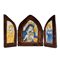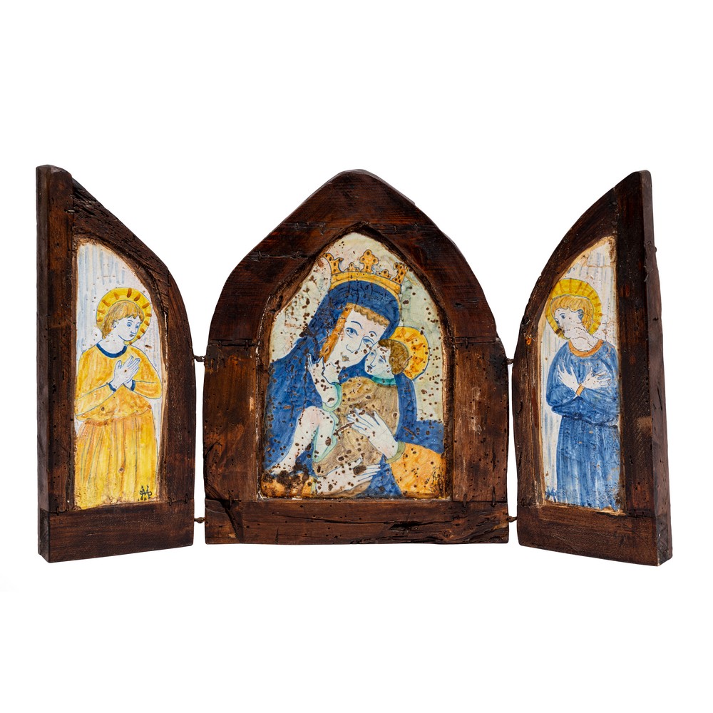 TRITTICO in ceramica con cornice in legno raffigurante "Madonna con Bambino e Santi".