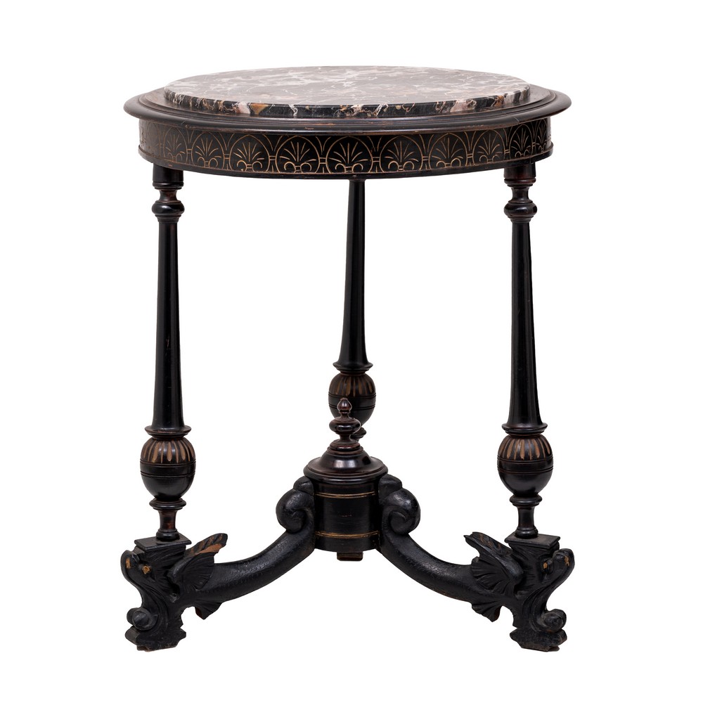 Tavolino tondo in legno ebanizzato e tarsie dorate con piano in marmo nero venato.