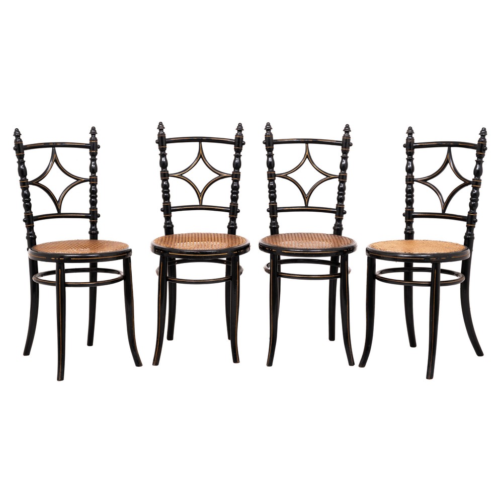 QUATTRO SEDIE FISCHEL in legno ebanizzato curvato a fuoco con sedute in paglia di Vienna (usure).