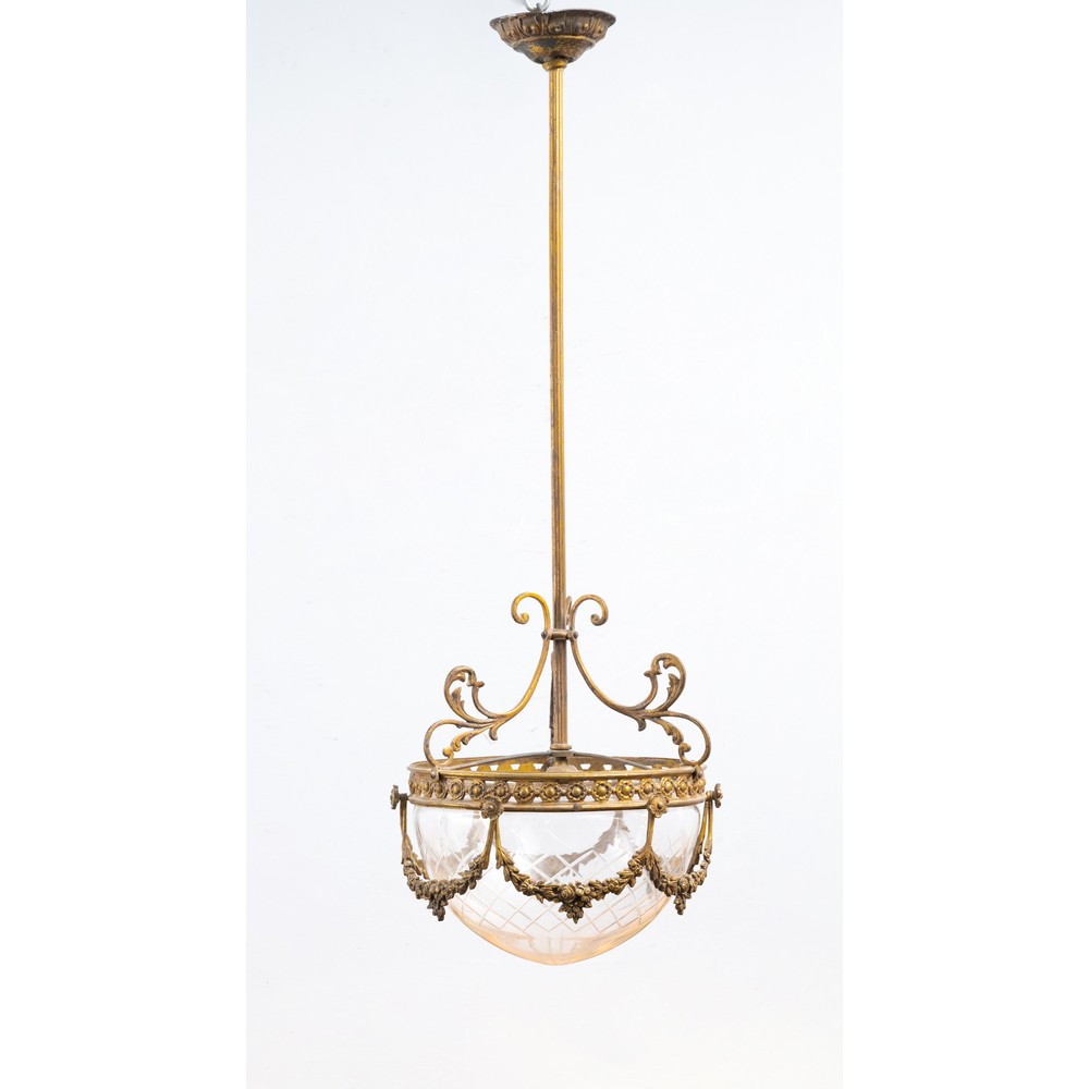 LAMPADARIO Liberty ad una luce in ottone e boccia in vetro trasparente.
