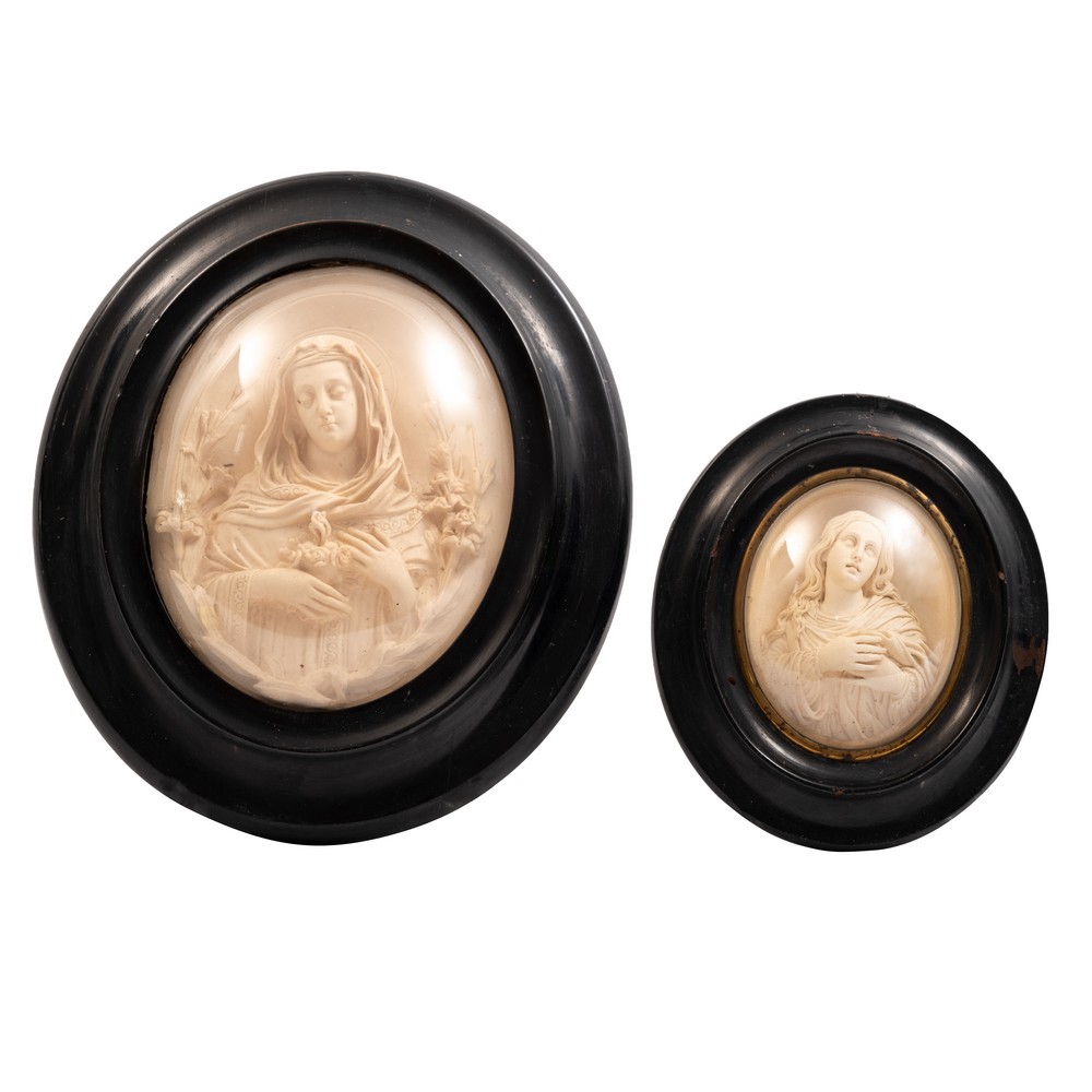 DUE OVALI in schiuma di gesso raffiguranti “Madonna”, entro cornice in legno ebanizzato.