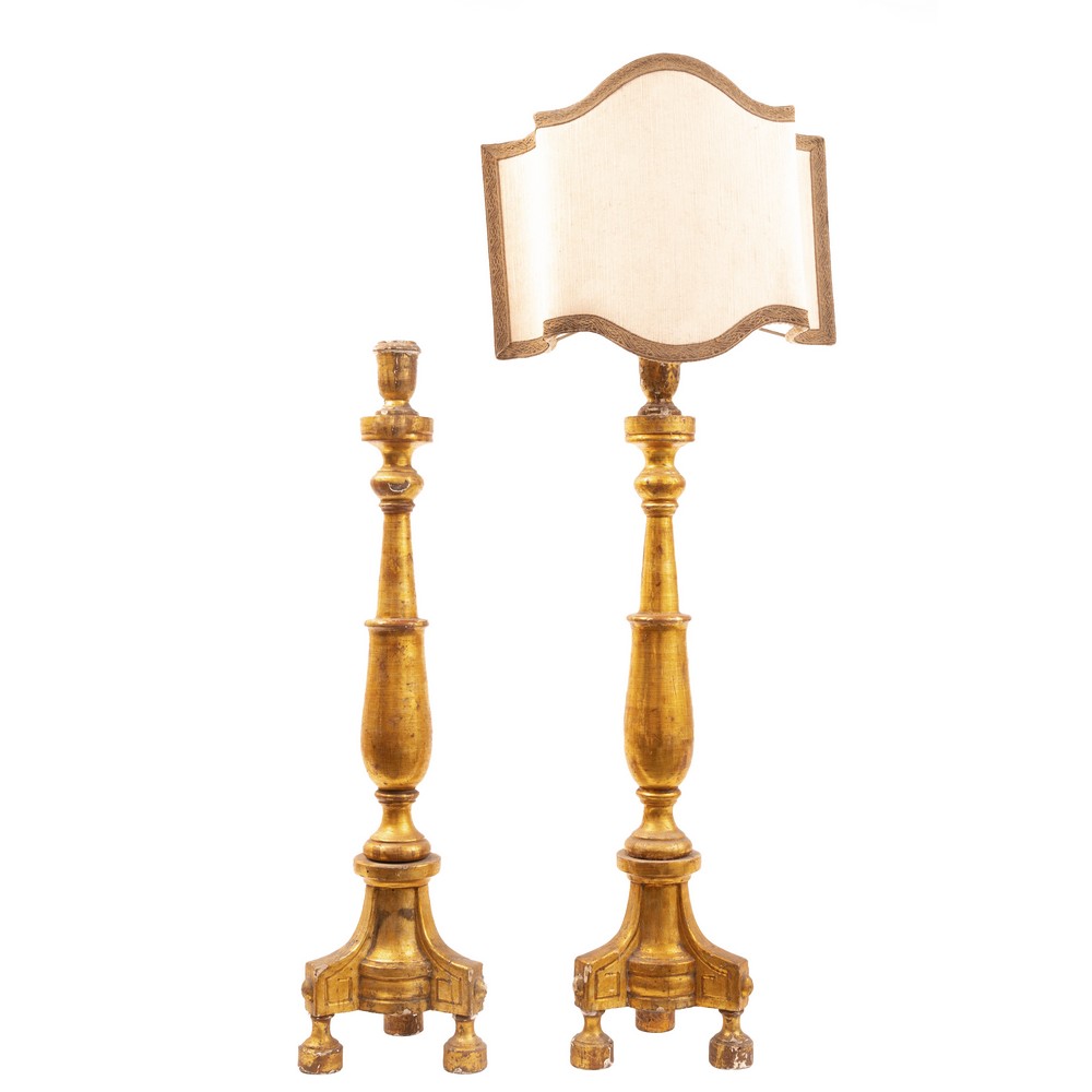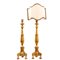 Coppia candelabri in legno dorato, di cui uno con ventola in tessuto ed elettrizzato.