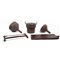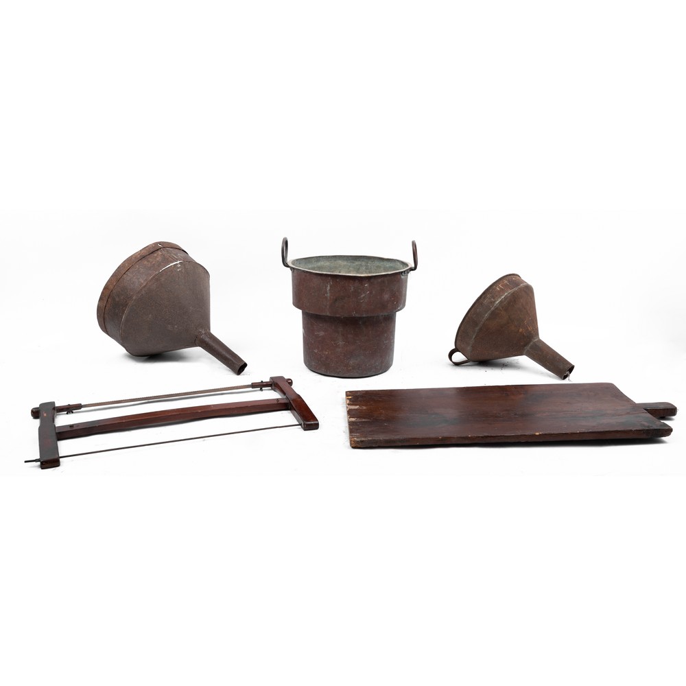 Due grandi imbuti in ferro, pentola in rame, tagliere da cucina e sega da falegname.