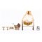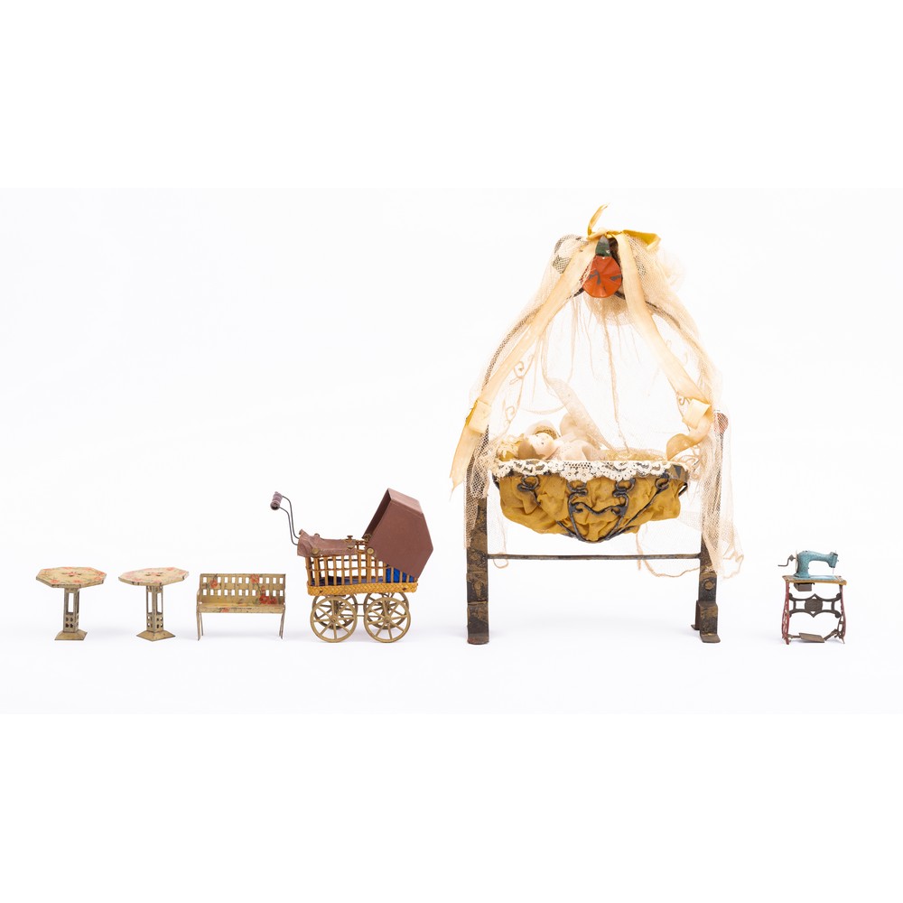 Culla con bambino, carrozzella, macchina da cucire, due tavolini e una panchina.