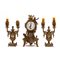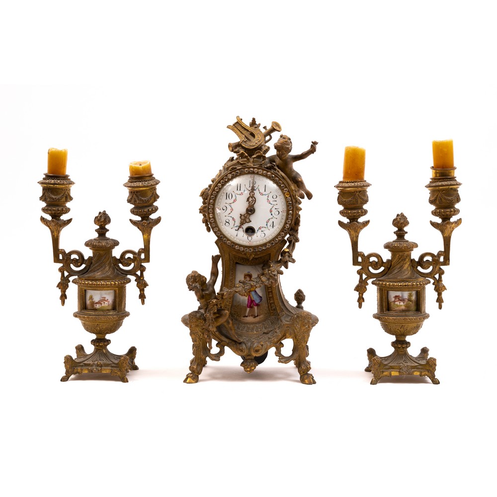 Trittico in metallo dorato e placche in porcellana dipinta composto da orologio e coppia candelabri a due fiamme.
