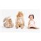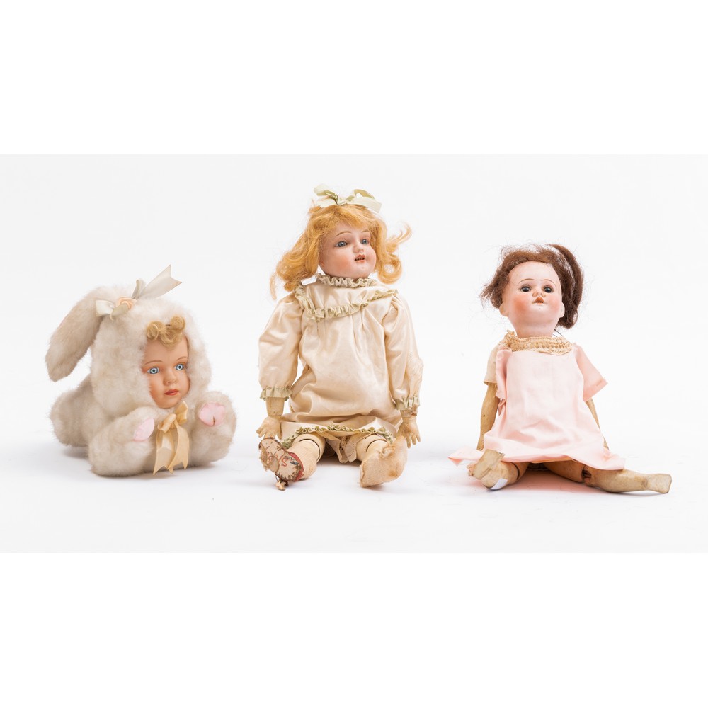 Un coniglietto di peluche con volto di bambola in biscuit e due bambole in legno e biscuit (usure e mancanze).
