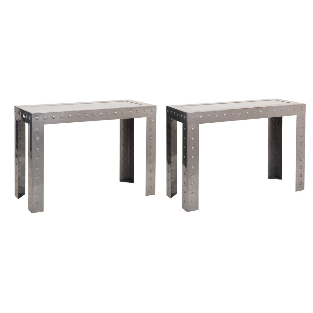 COPPIA CONSOLLE in acciaio con borchie e piano in vetro.