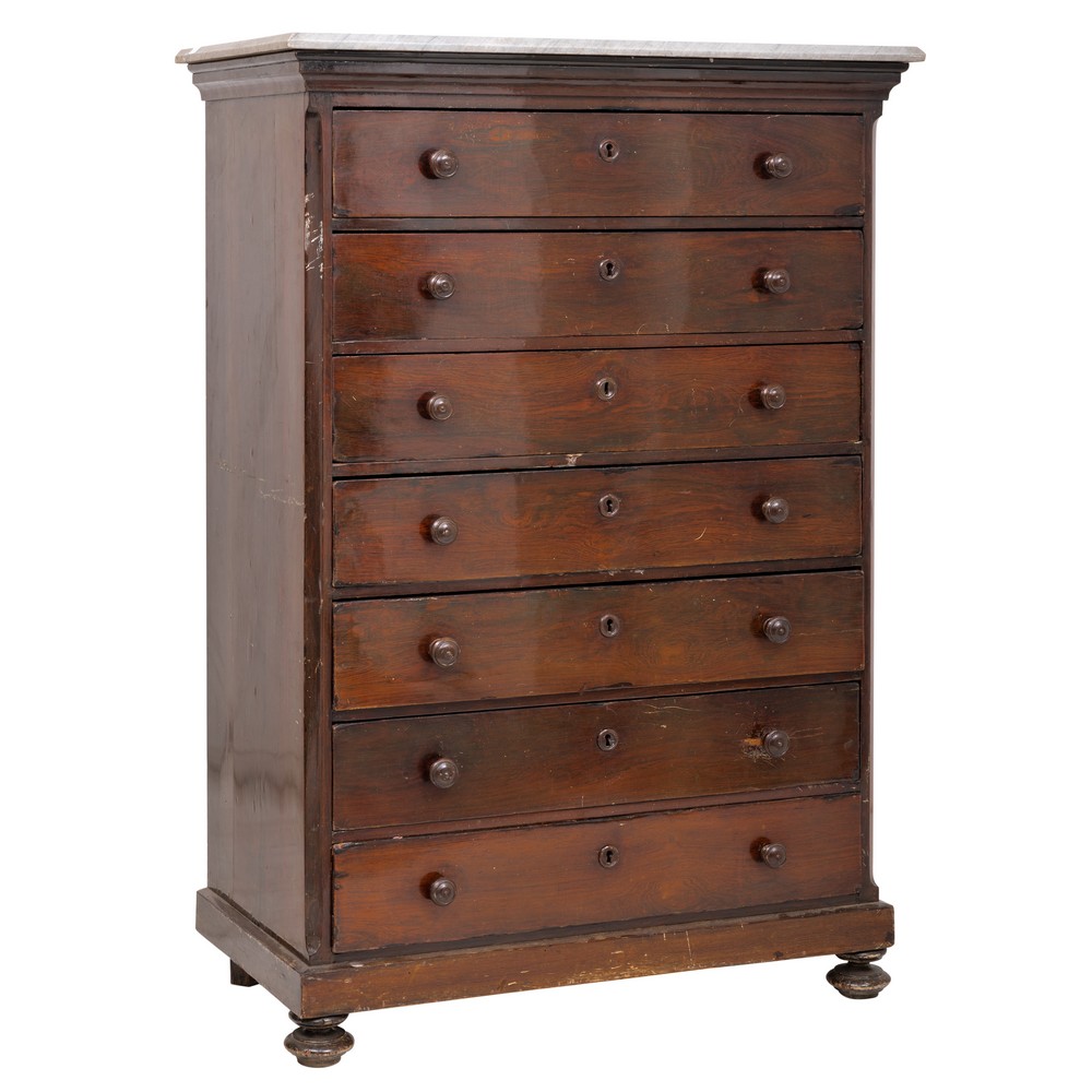 SETTIMINO a sette cassetti in legno di palissandro con piano in marmo grigio.