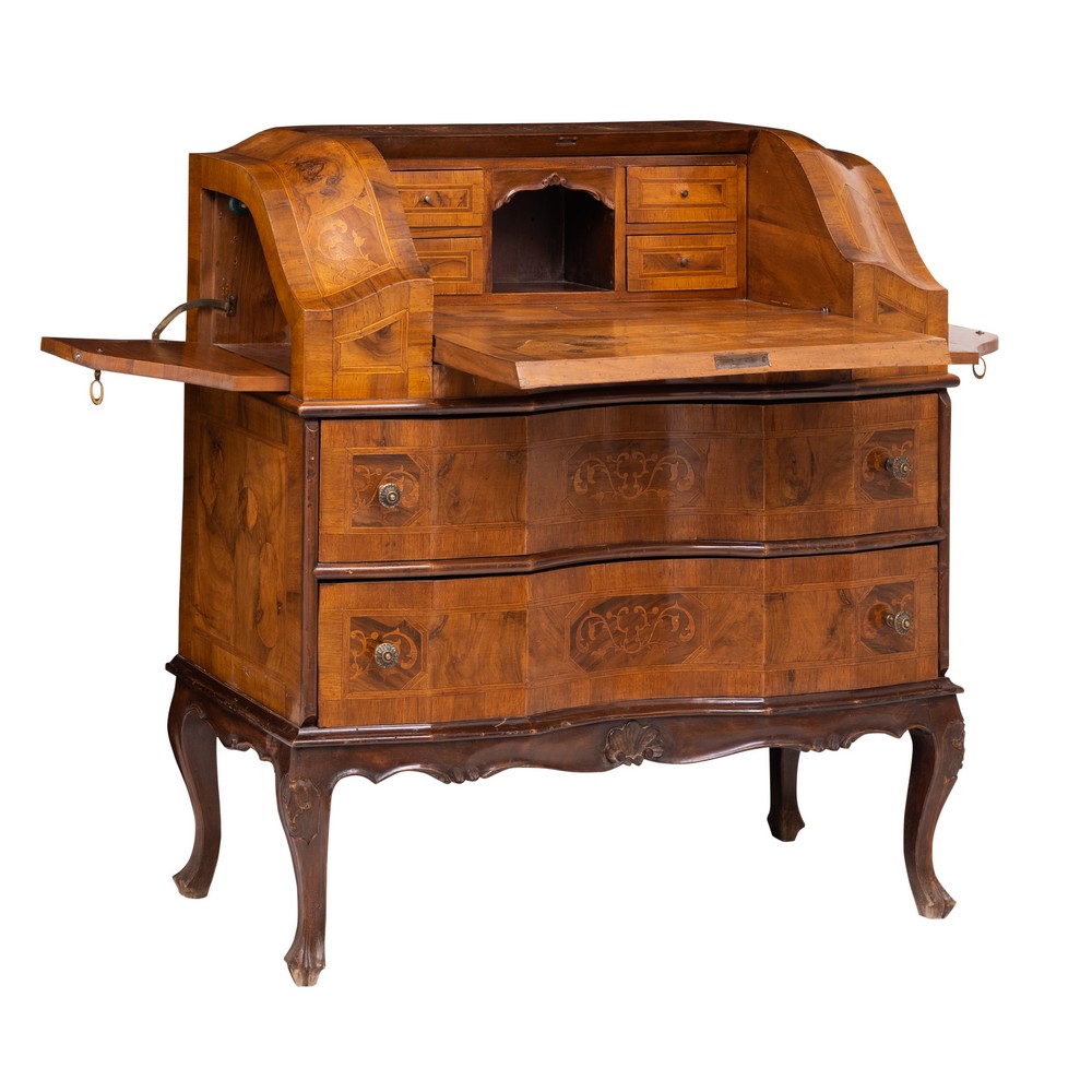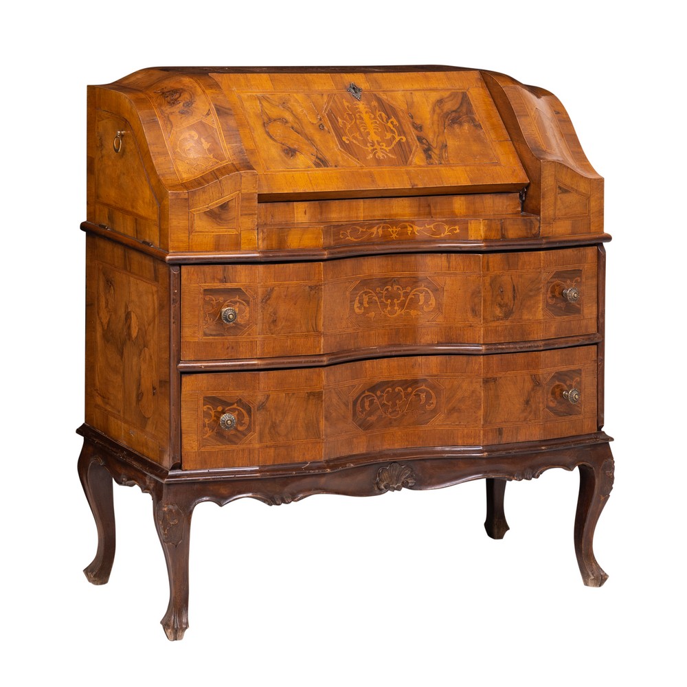 RIBALTINA in stile Barocco a tre cassetti in legno di noce, radica di noce con tarsie in bosso.