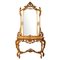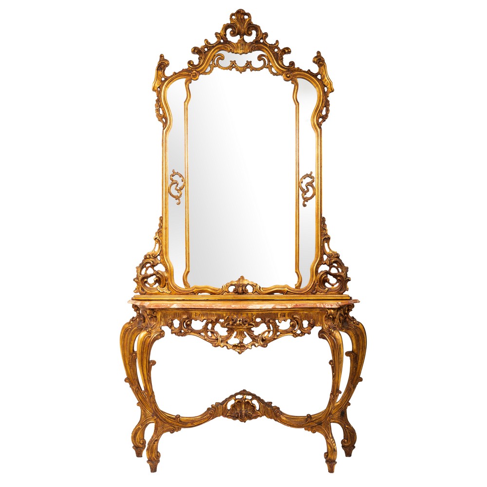 CONSOLLE con specchiera di gusto Barocco in legno intagliato e dorato, con piano in marmo rosa brecciato.