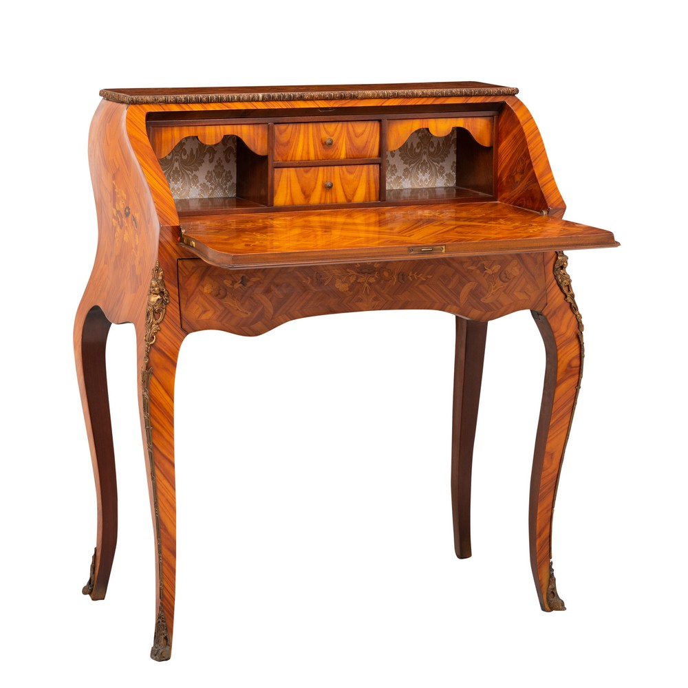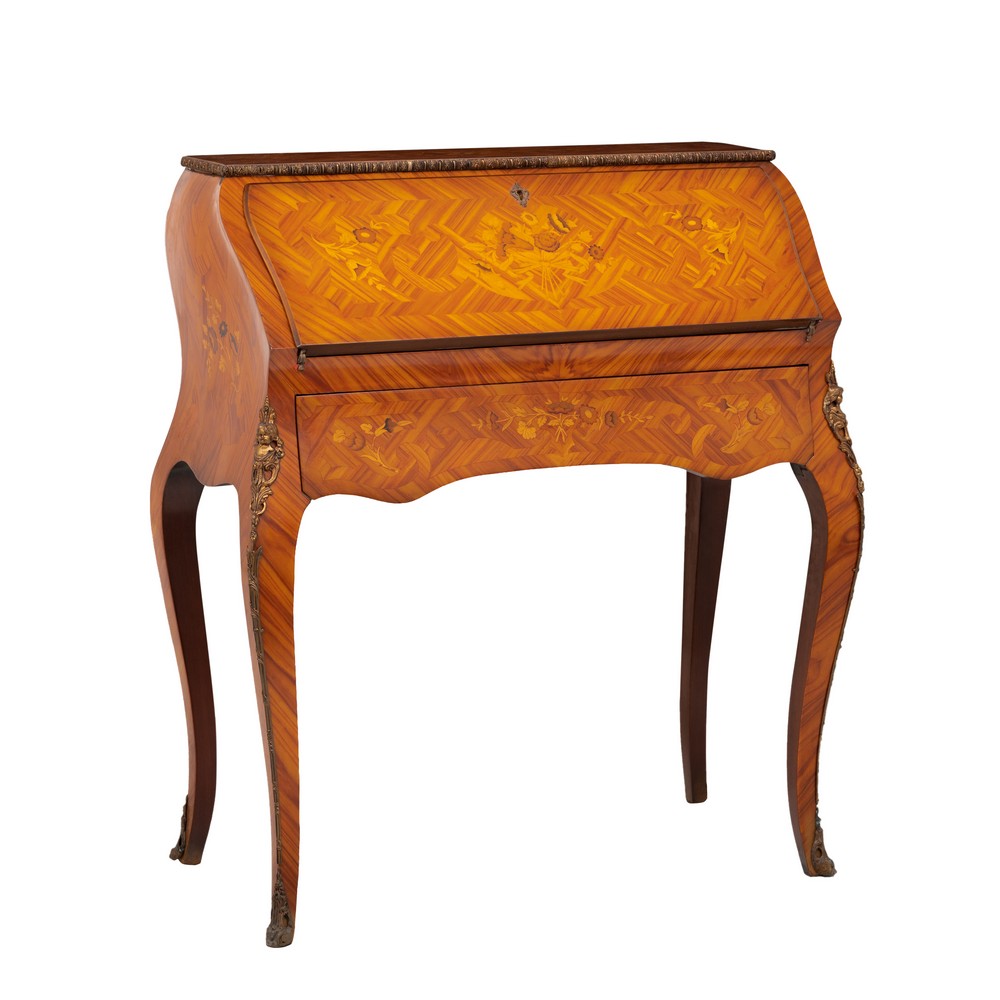 RIBALTINA in legno rosa lavorato a lisca di pesce, con tarsie in bosso, guarnizioni in bronzo, con ribalta e cassetto.