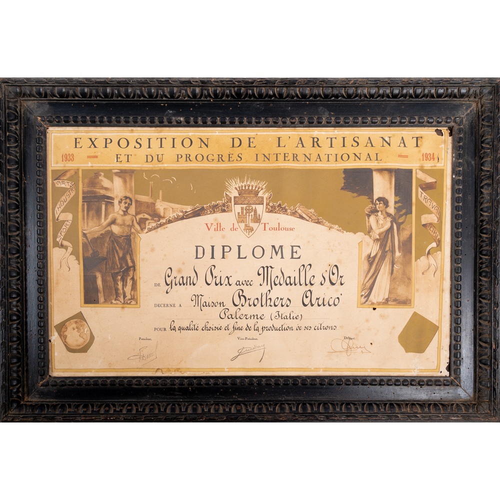 DIPLOMA dell'Espansione dell'Artigianato e del Progresso interazione (1933 - 1934), nella città di Toulouse (Francia) dato dall'azienda dei fratelli Arilò Palermo, entro cornice in legno ebanizzato.