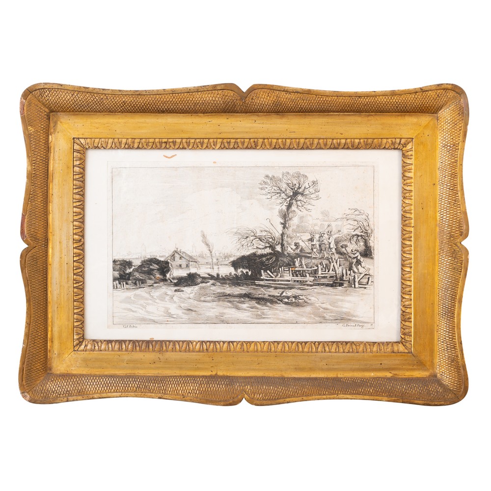 Cornice a guantiera in legno dorato ad argento a mecca, con all'interno incisione bianco e nero raffigurante "Paesaggio con personaggi".