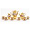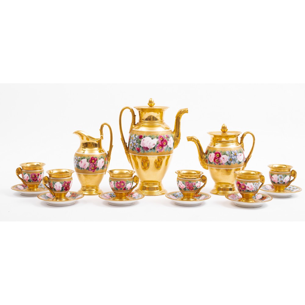 Servizio Impero da caffè composto da: caffettiera, teiera, lattiera e 6 tazze con piattino in porcellana, decorate a mano floreale e fogliesco, oro zecchino.