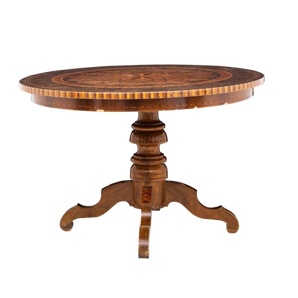 Tavolo Sorrentino tondo in legno di noce, con tarsie in bosso , fusto a colonna e piedi a sciabola.