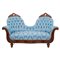 Divano Luigi Filippo in legno di noce, con tessuto decorato blu spalliera capitonnè.