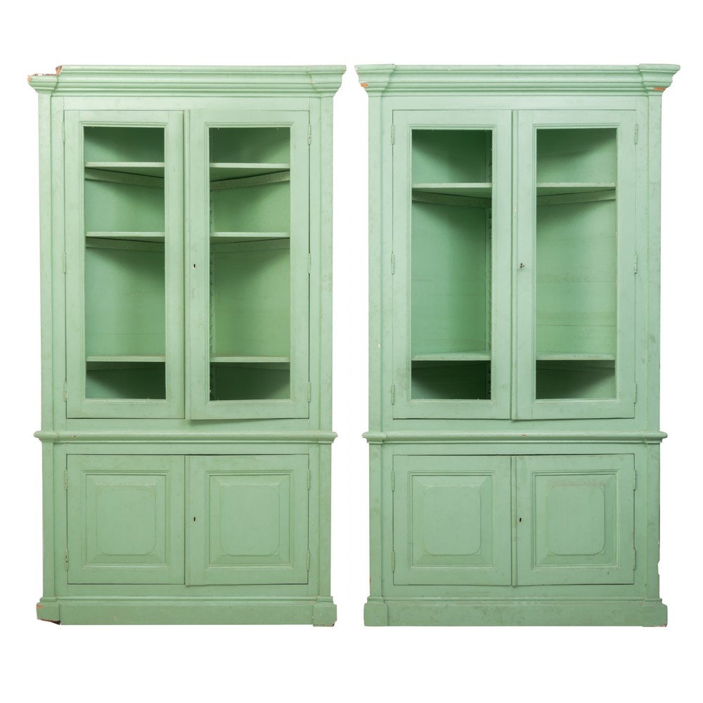 COPPIA ANGOLIERE in legno laccato nei toni del verde.