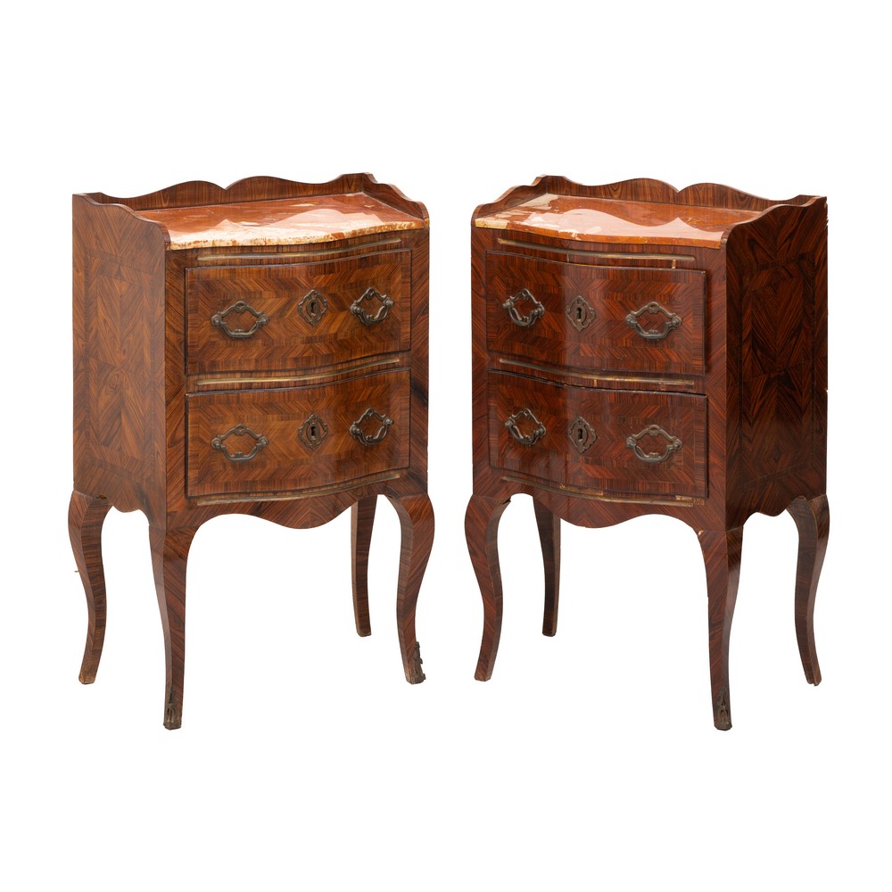 Coppia comodini stile Luigi XIV a due cassetti in ebano violetto lavorato a lisca di pesce, piano in marmo rosso venato.