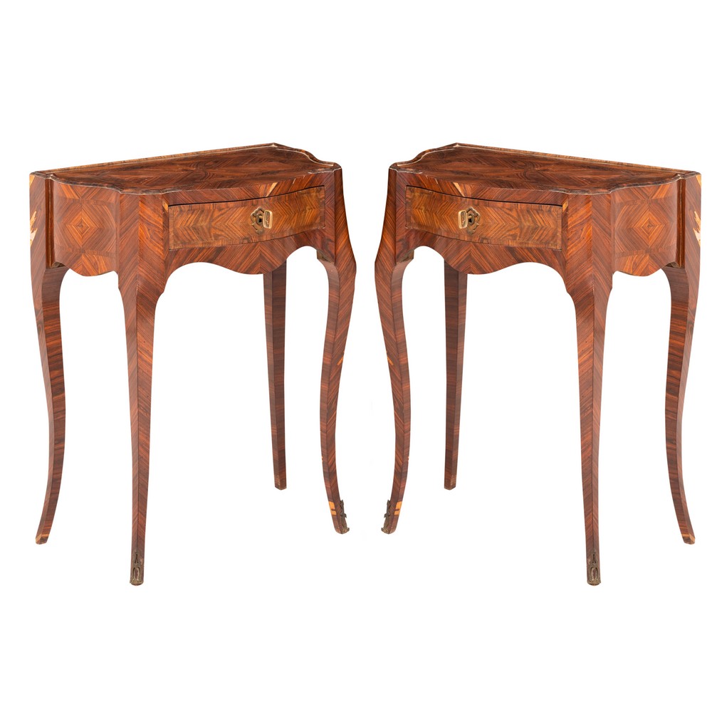 Coppia piccole consolle stile Luigi XIV con cassetto centrale in ebano violetto lavorato a lisca di pesce (mancanze).