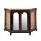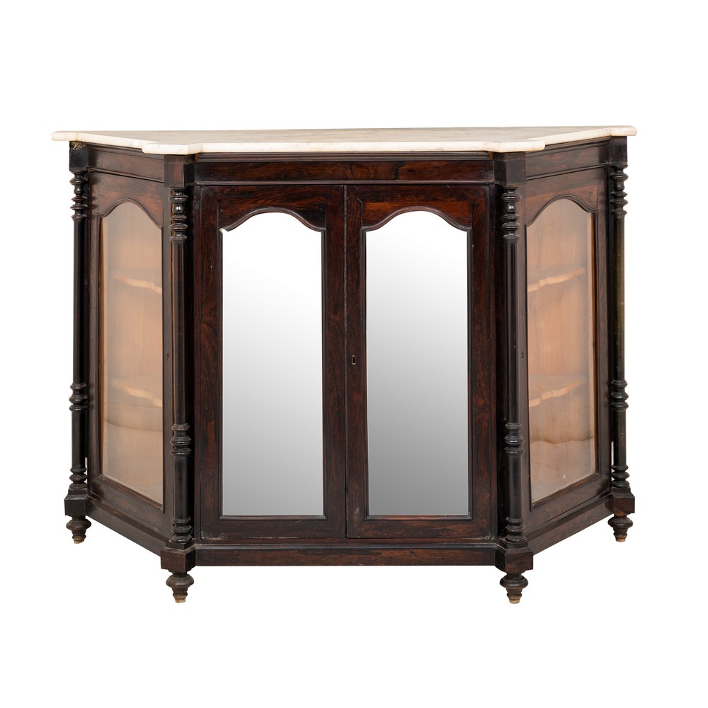 Etagere di forma scantonata a 4 ante, le due centrali a specchio e le due laterali a vetri in legno di palissandro, piano in marmo bianco di Carrara.