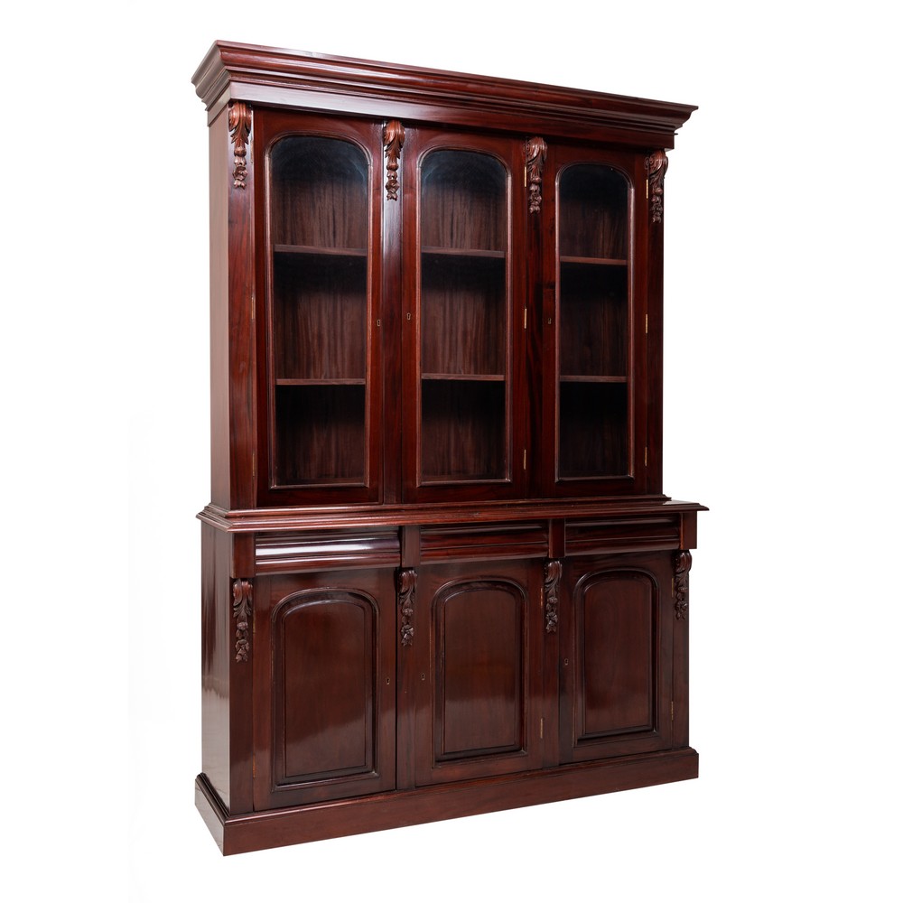 Vetrina doppio corpo in legno di mogano a tre ante a vetri nella parte superiore, tre cassetti e tre sportelli nella parte inferiore.