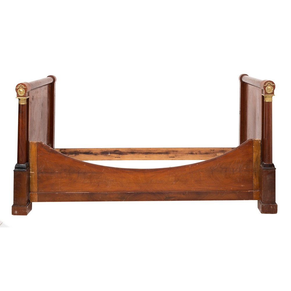 Letto Impero in legno di mogano, con capitelli e fregi in metallo dorato.