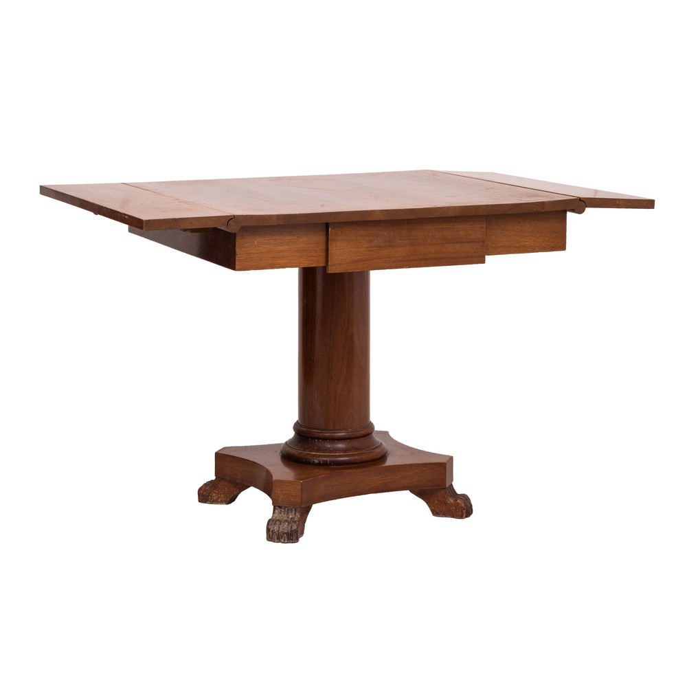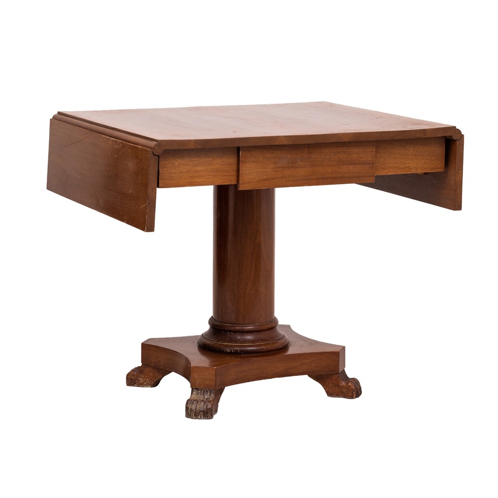 TAVOLO con alette in legno di mogano con cassetto centrale.