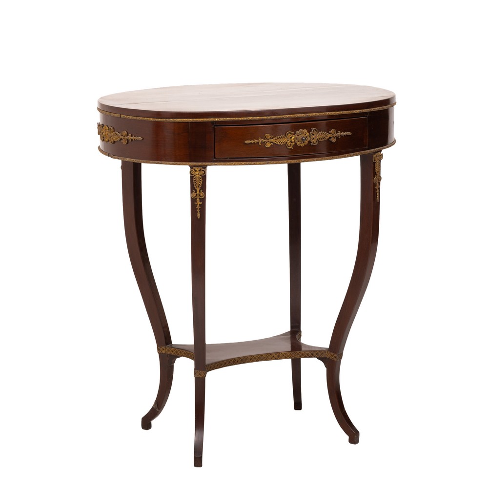 Tavolo Impero di forma ovale in legno di mogano, con guarniture in bronzo.