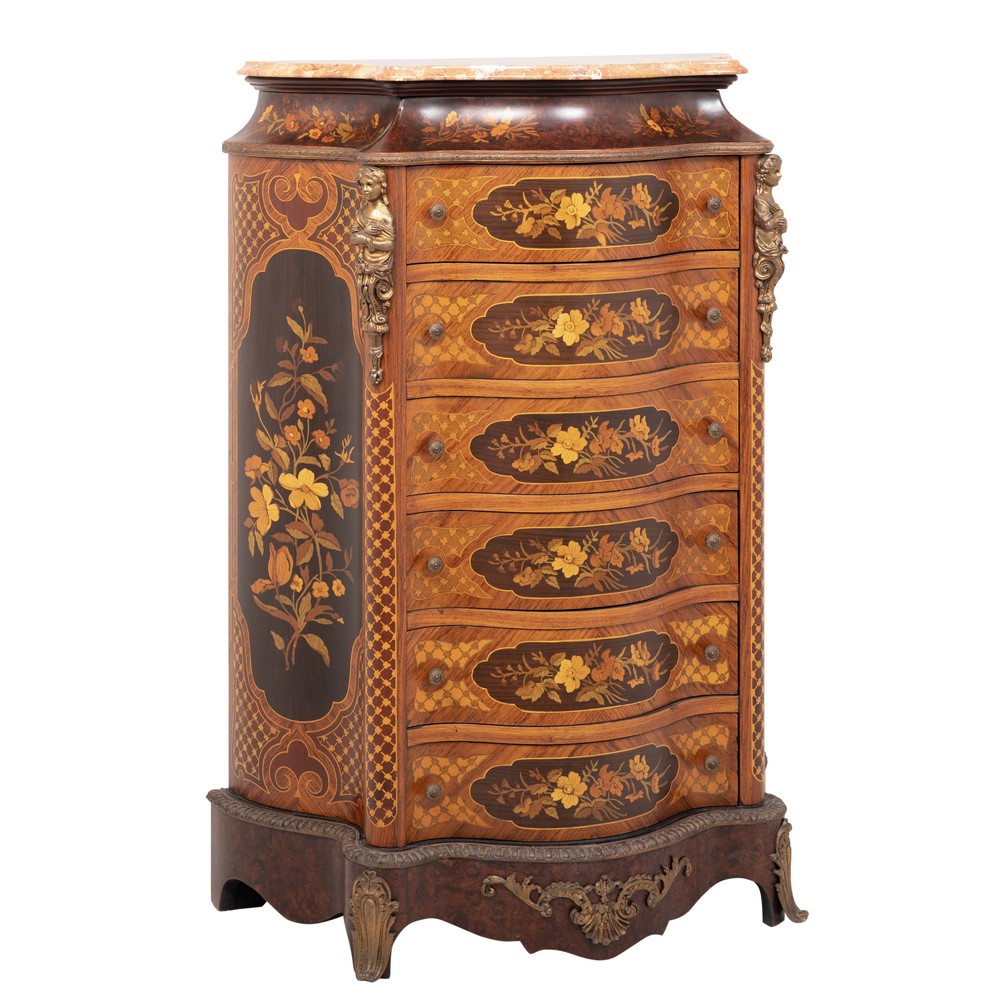 CASSETTIERA a sei cassetti di forma sagomata in legno di rosa, radica di noce, riccamente intarsiata in vari tipi di legno da frutto, guarnito da bronzi, piano in marmo rosso venato.