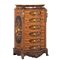 CASSETTIERA a sei cassetti di forma sagomata in legno di rosa, radica di noce, riccamente intarsiata in vari tipi di legno da frutto, guarnito da bronzi, piano in marmo rosso venato.