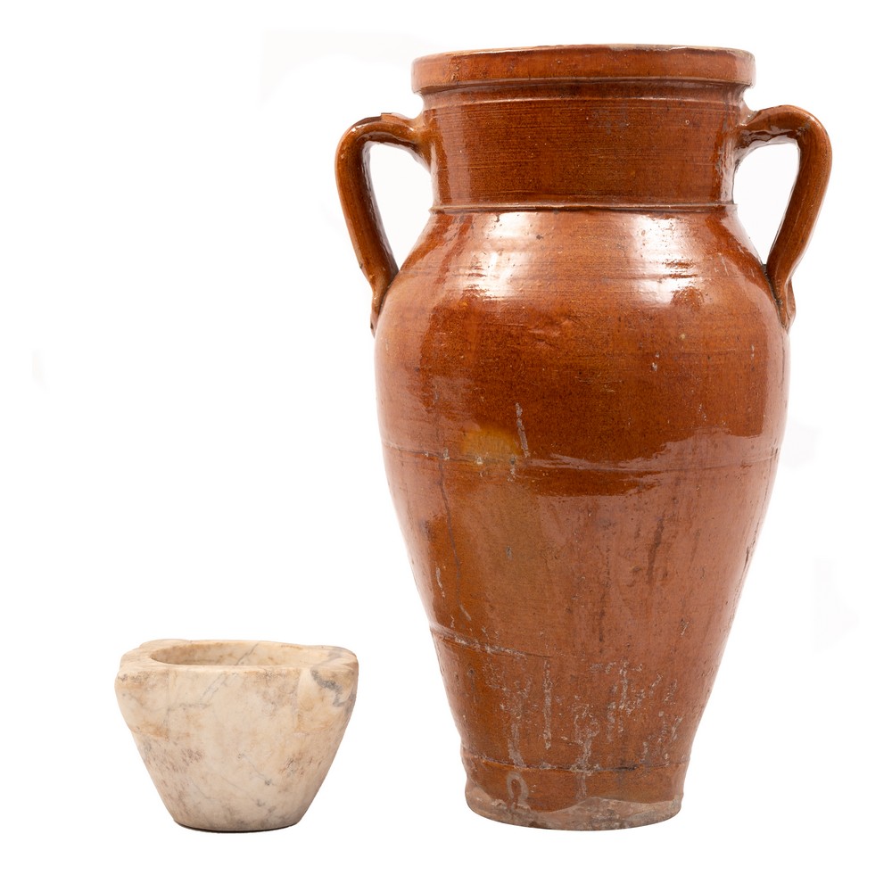 GIARA in terracotta smaltata e piccolo mortaio in marmo.