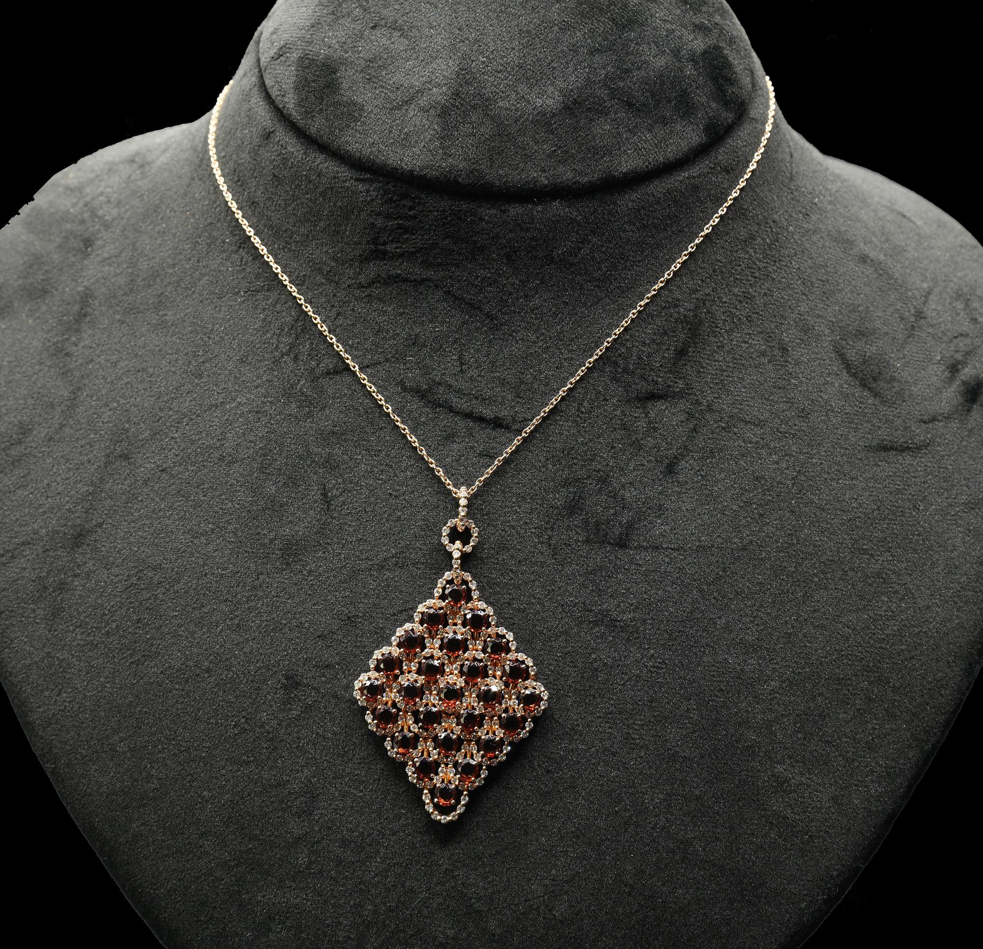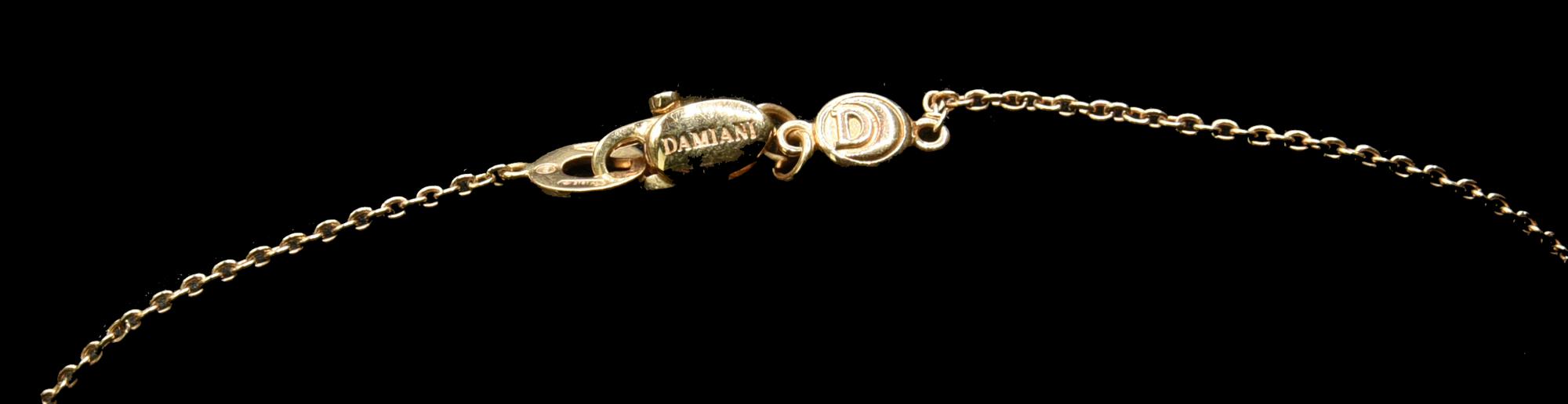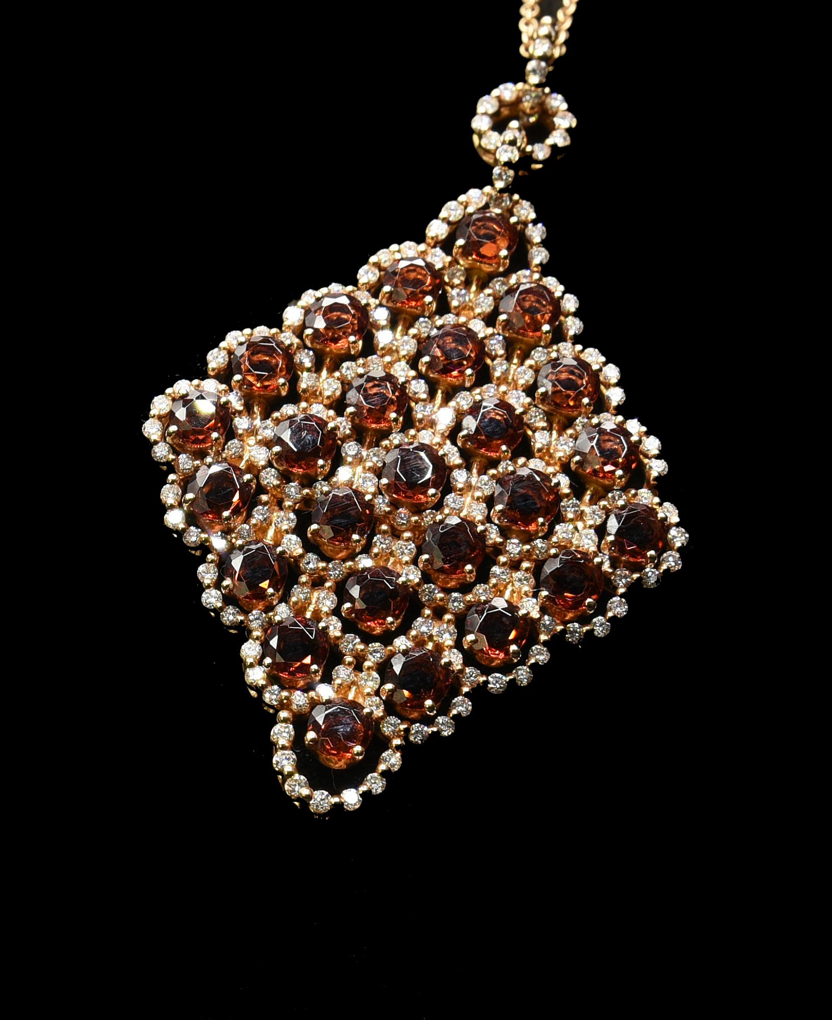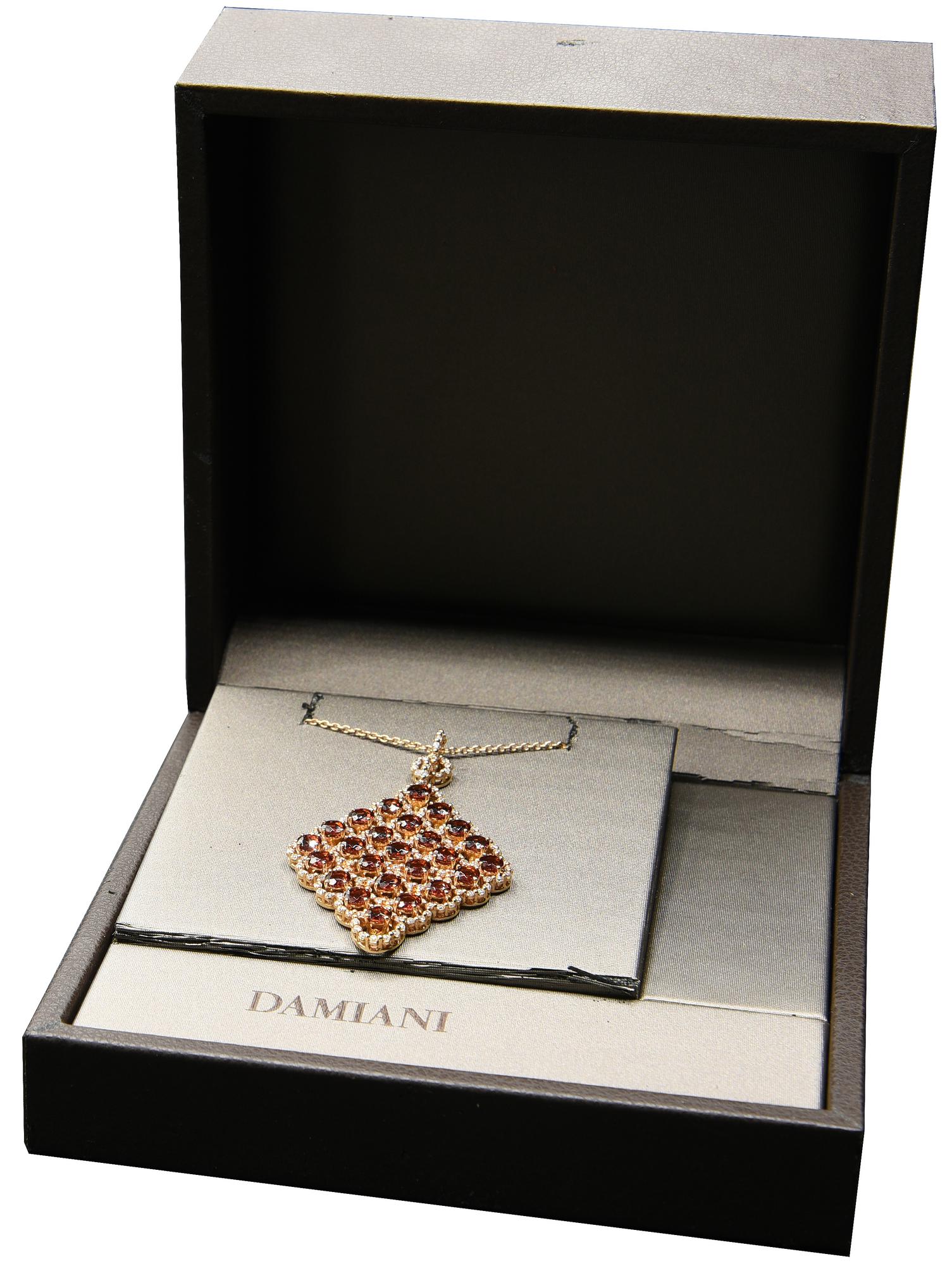 appartenente alla collezione Juliette, realizzata con un pendente a maglia morbida, impreziosito da diamanti di forma rotonda taglio a brillante per ct. complessivi 1,10 circa e granati di forma rotonda a taglio composito. Punzone 750, 3181AL-Damiani, lunghezza cm 51,5, dimensione pendente cm 6x3,5, peso complessivo gr. 22,2