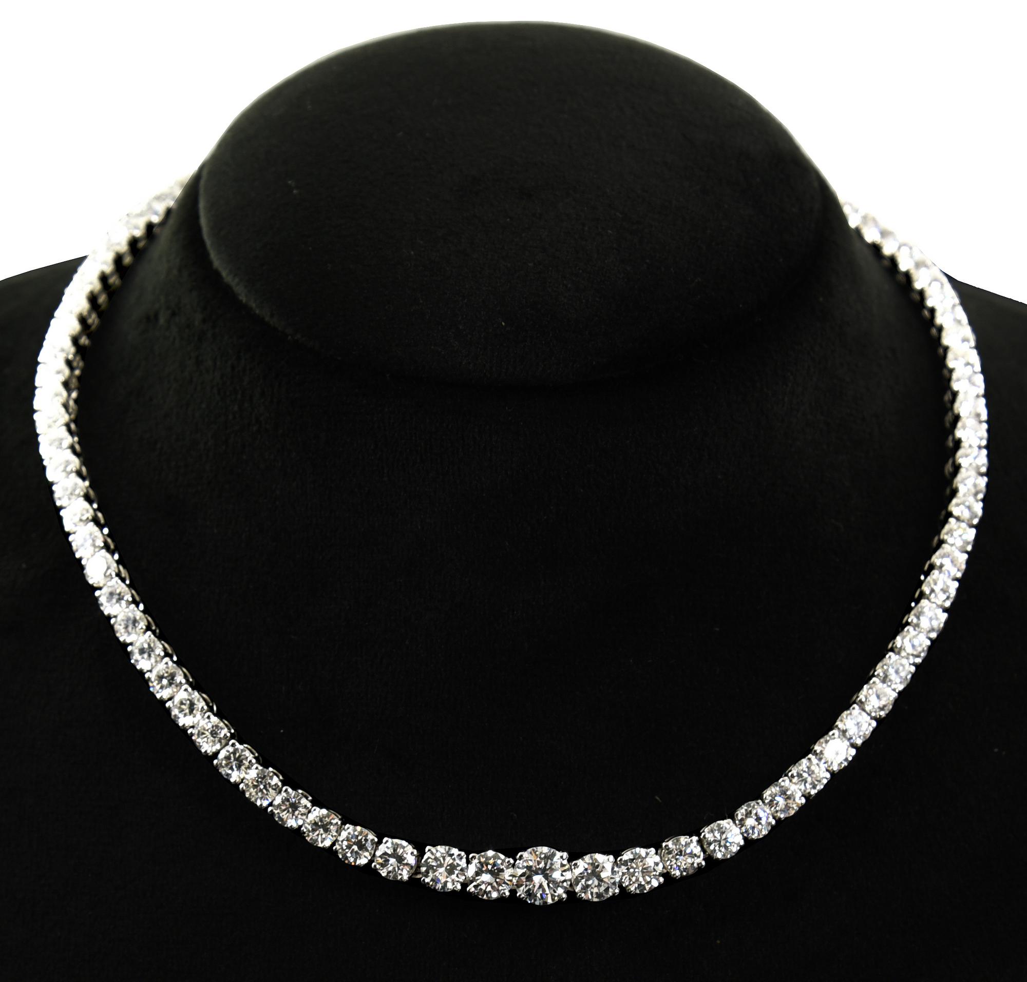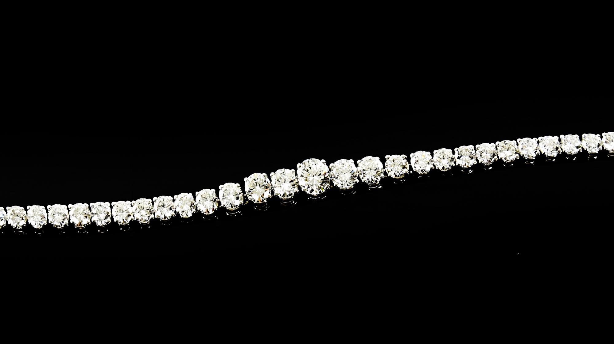 realizzato ad una fila di 87 diamanti degrade' di forma rotonda taglio a brillante ct. 0,25-1,15 per ct. complessivi 25,55 circa, grado di colore G, grado di purezza VS, chiusura in oro e diamanti per ct. 0,45 circa. Lunghezza mm 390, peso complessivo g 41,3
