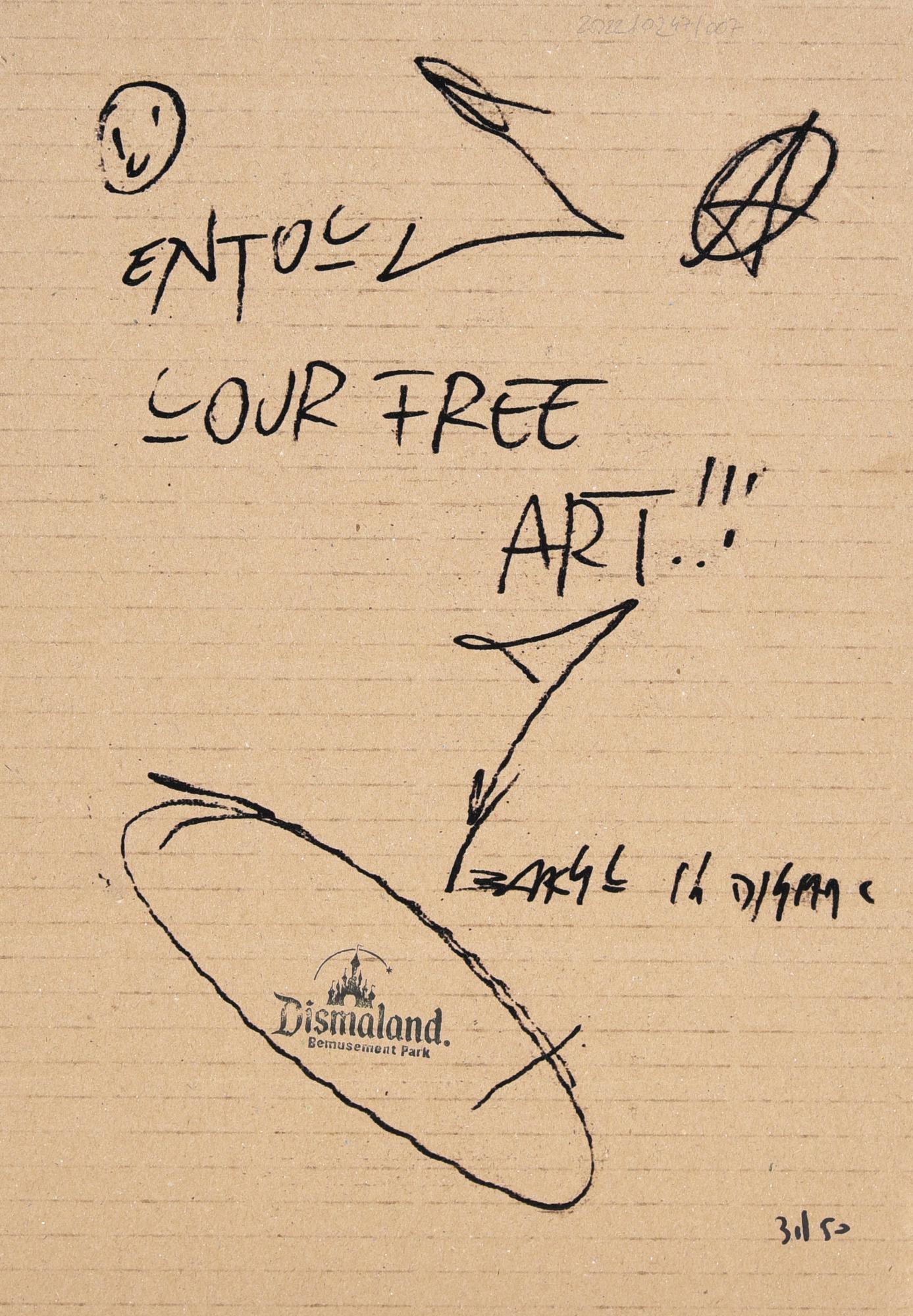 sul retro: timbro Dismaland ed iscritto "enjoy your free art. Banksy is Dismal"
