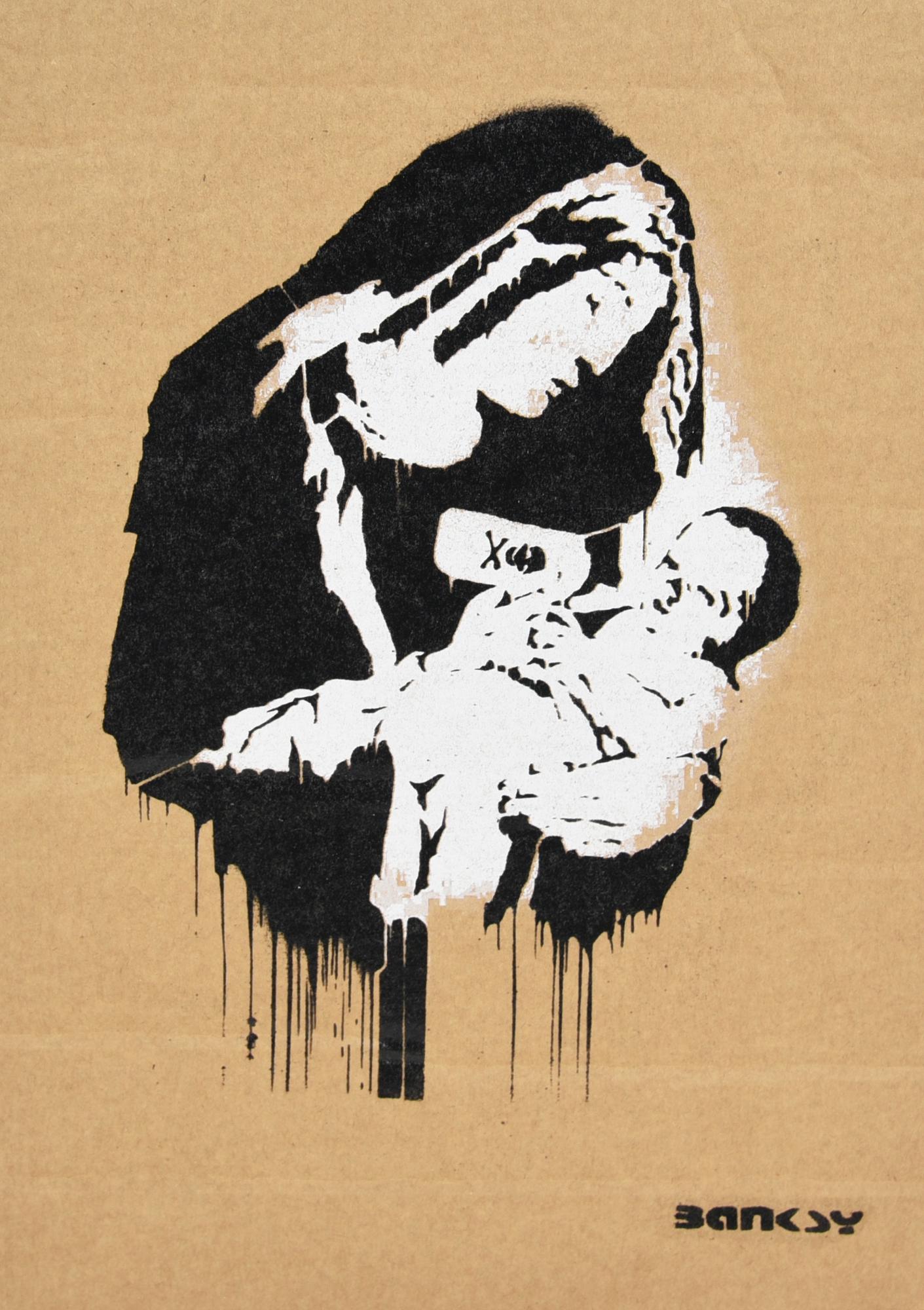 Banksy TOXIC MARY sprayed stencil graffiti su cartone, cm 29,5x21; es. 31/50...