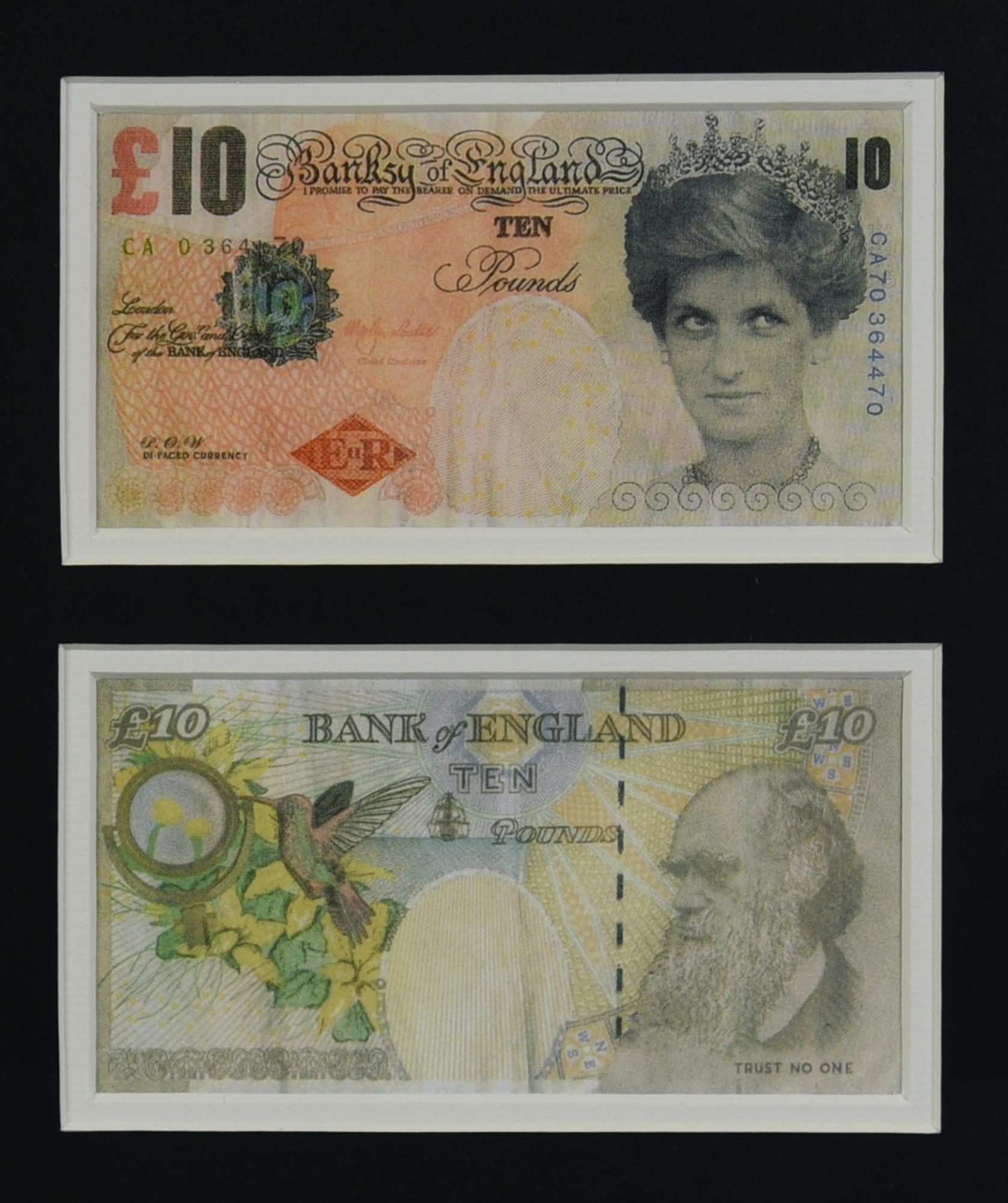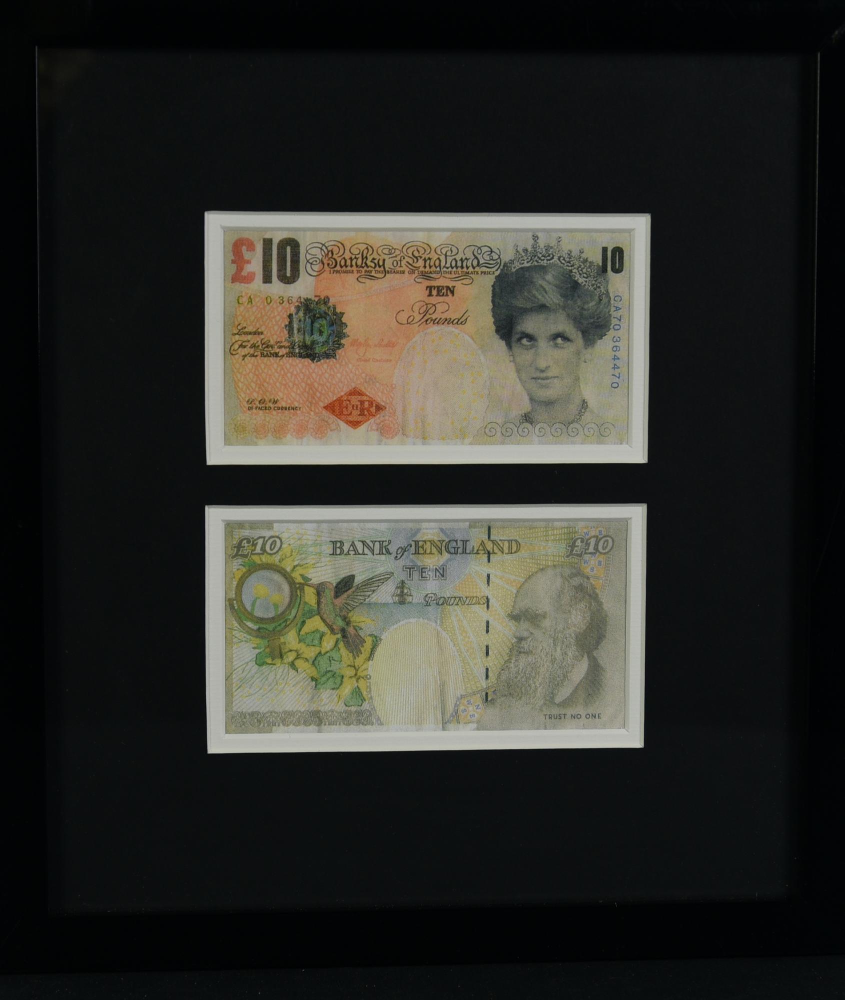Da Banksy TENNER DUO 2 fac simile di banconote da 10 pounds entro cornice, cm...