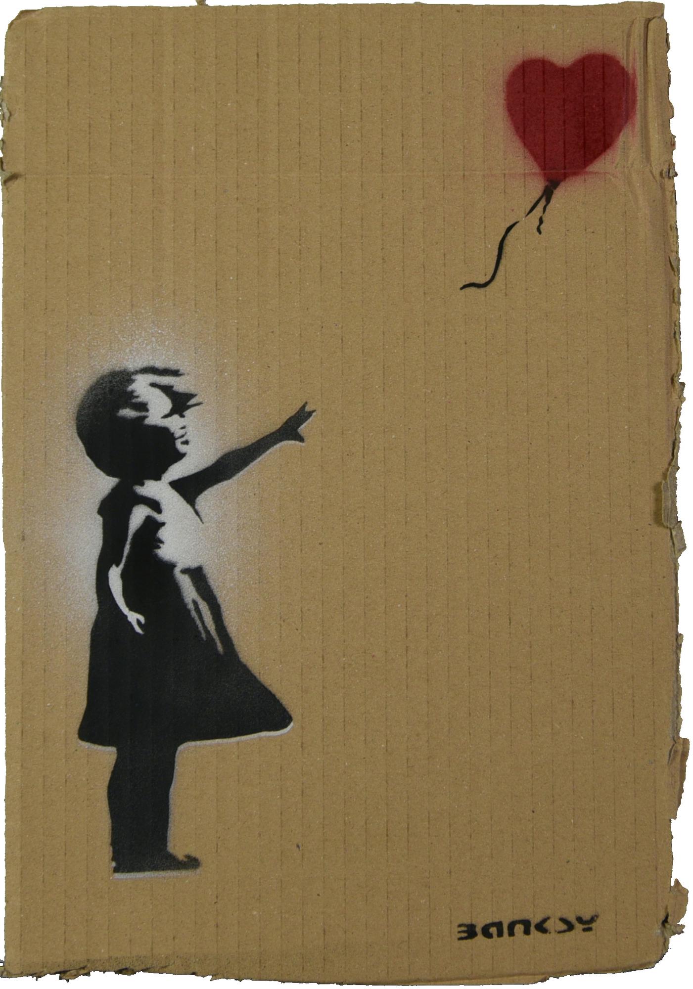 Banksy GIRL WITH BALLOON, 2015 sprayed stencil graffiti su cartone, cm 30x20;...