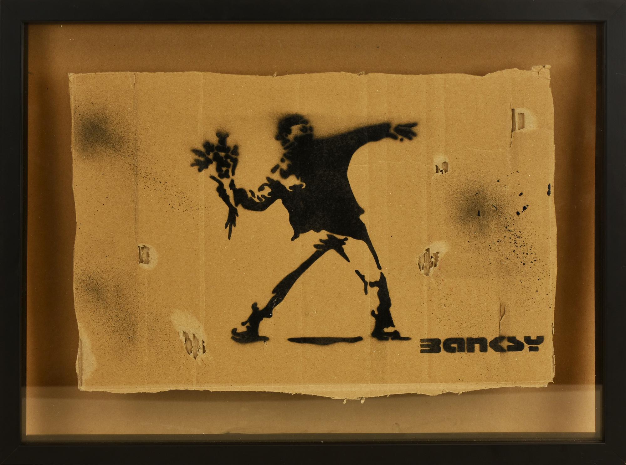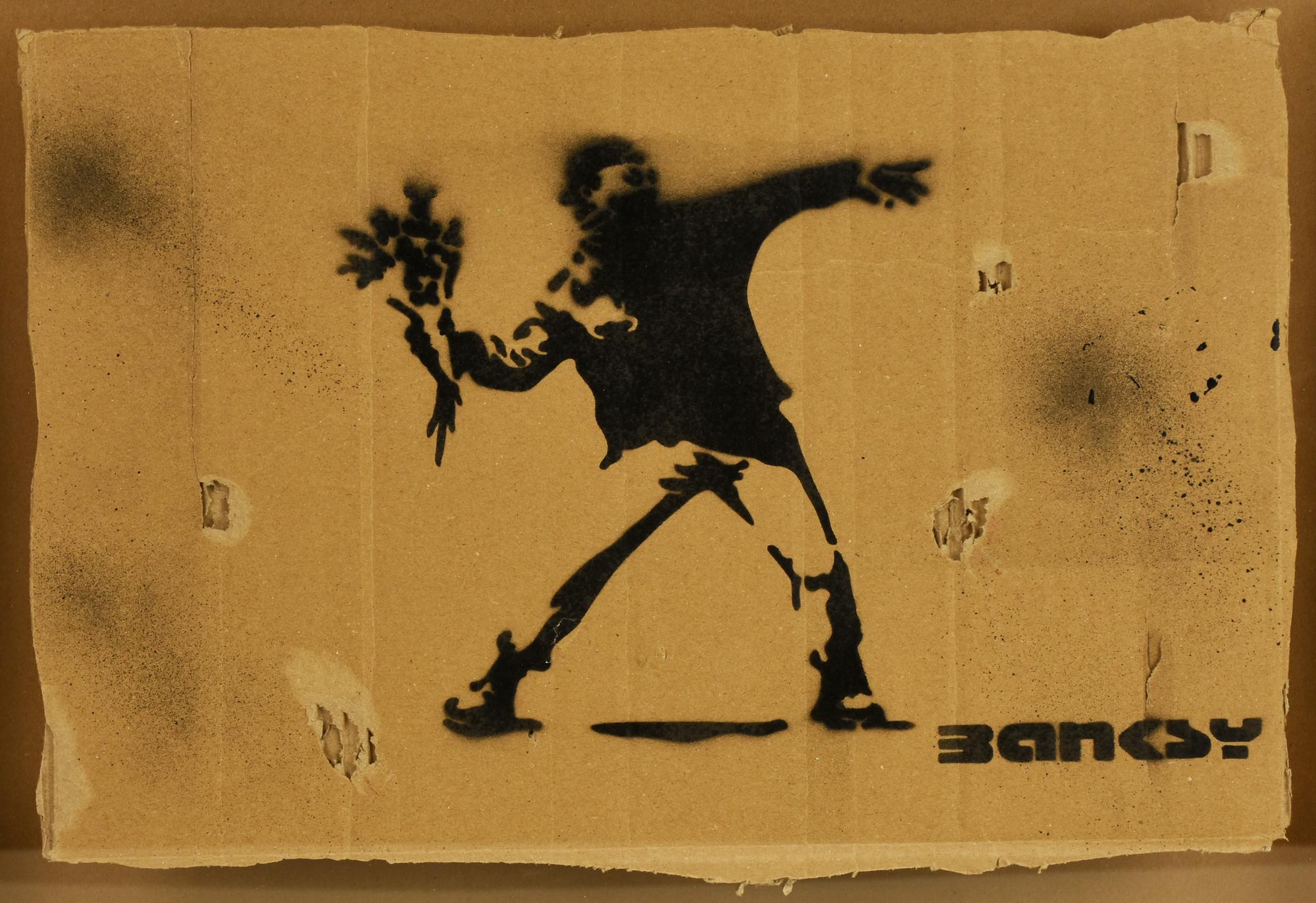 Banksy FLOWERS THROWER sprayed stencil graffiti su cartone, cm 27x38,5 sul...