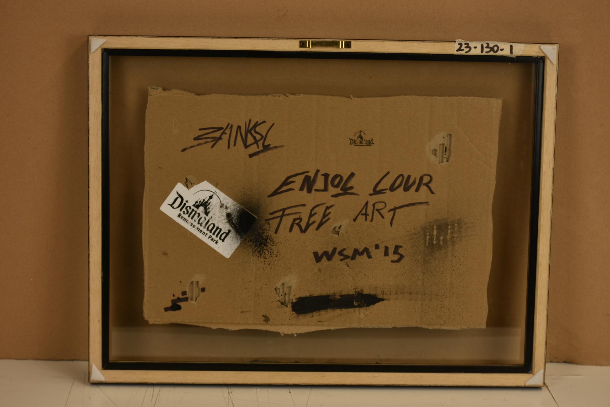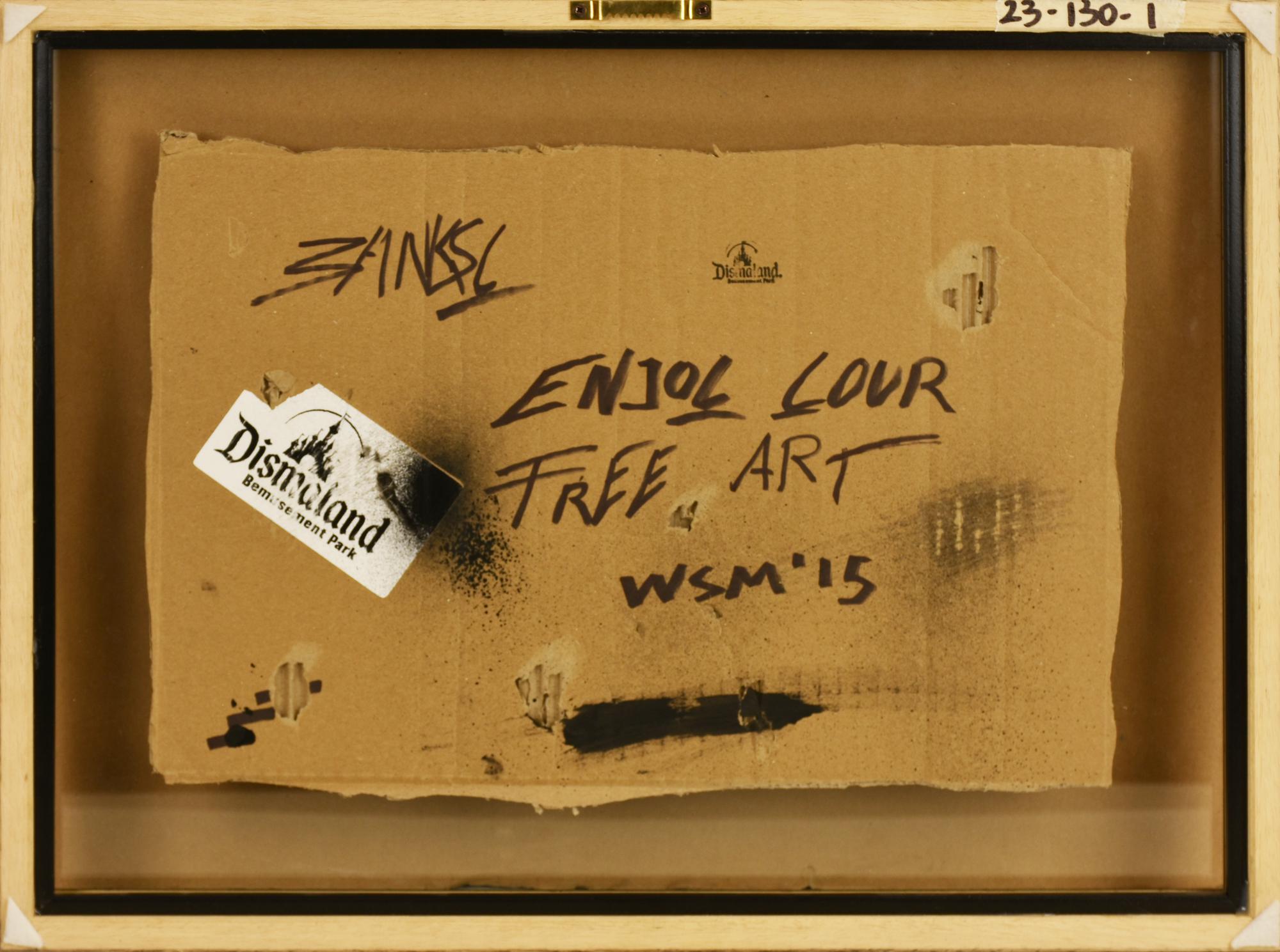 sul retro: iscritto "Enjoy your free Art" WSM '15 con timbri e adesivi Dismaland