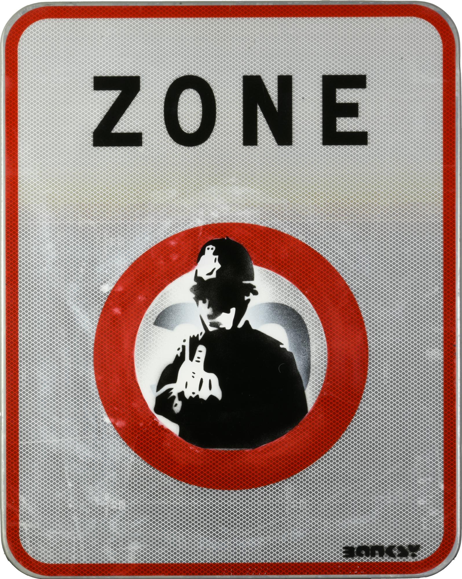 Da Banksy RUDE COPPER stencil print su cartello stradale, cm 66,5x51,5 firma...