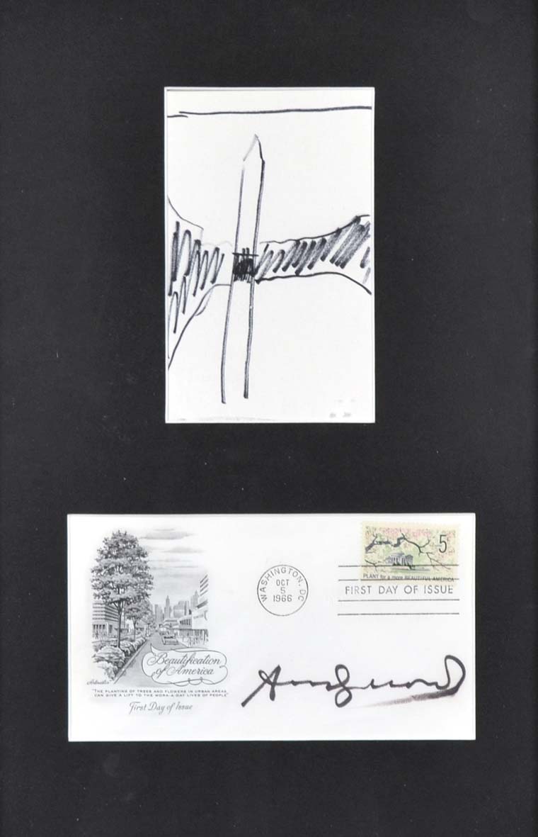 WARHOL ANDY Pittsburg (USA) 1928 - New York 1987 Washington Monument 1966 disegno a pennarello su carta 13,5x8,3 firma e dedica ad personam al verso Provenienza: Galleria Farsetti Arte Prato - timbro al retro opera accompagnata da una busta autografata, con timbro datato 1966