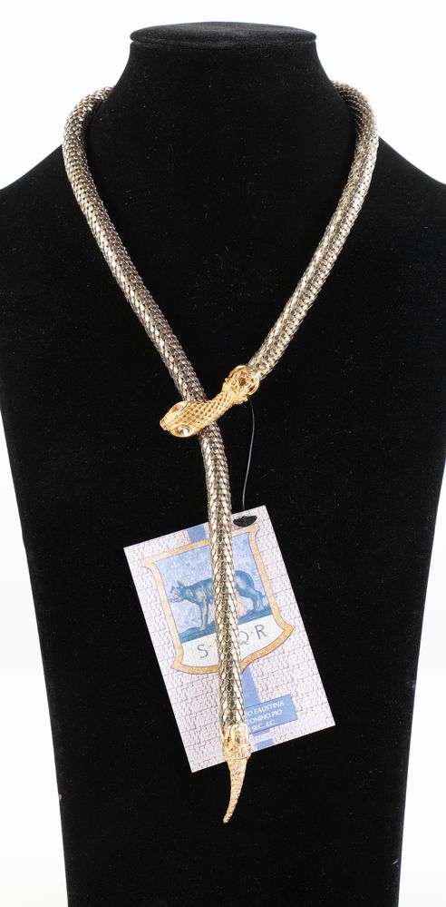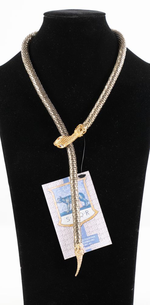 Collana a forma di serpente in metallo argentato con finiture in metallo dorato. Lunghezza cm 70.