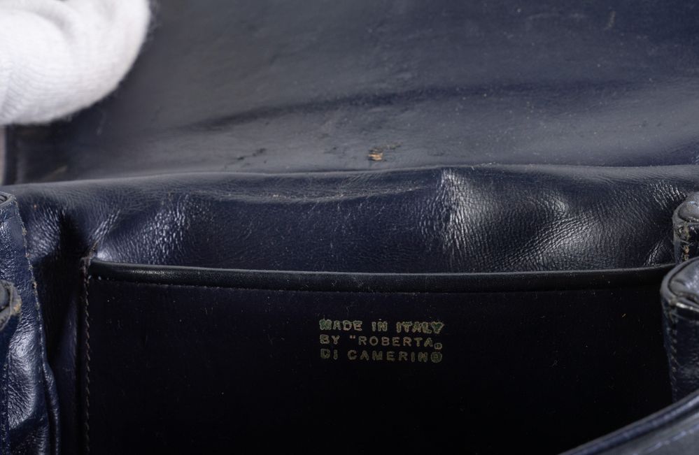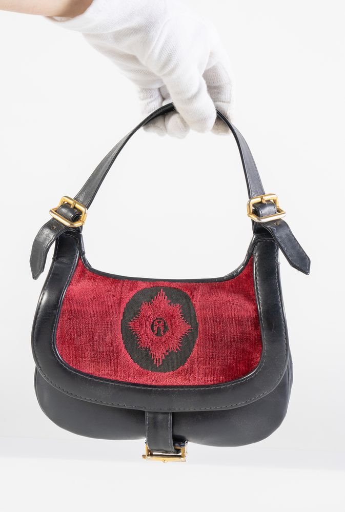 ROBERTA DI CAMERINO Borsa in pelle nera con applicazione in velluto rosso con logo e finiture in metallo dorato. Cm 13x19x4; altezza con manico cm 25. Reca allungo per il manico. All'interno reca due tasche. Reca marchio Made in Italy by Roberta di Camerino. (lievi difetti)