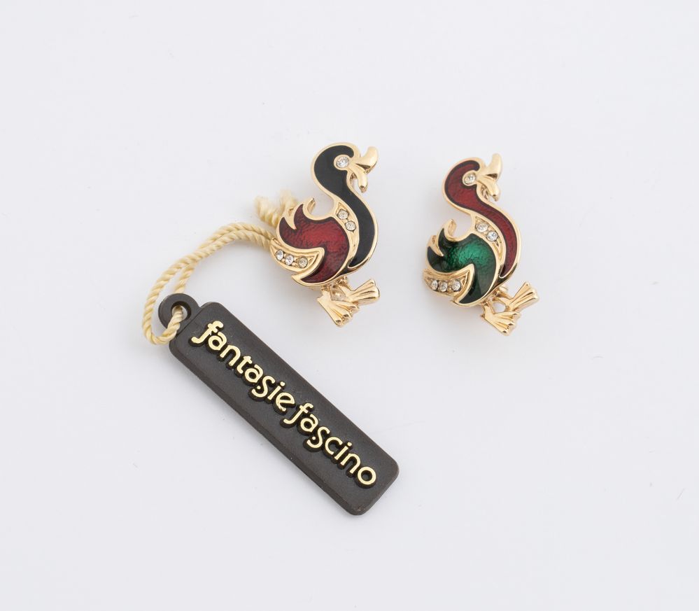 FANTASIE FASCINO Coppia di spille in metallo dorato, smalti e strass a forma...