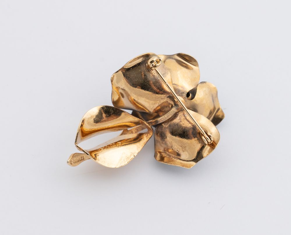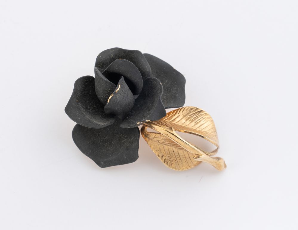CERRITO Spilla a forma di rosa in metallo dorato e smalto nero. Cm 5,5x4. Al...