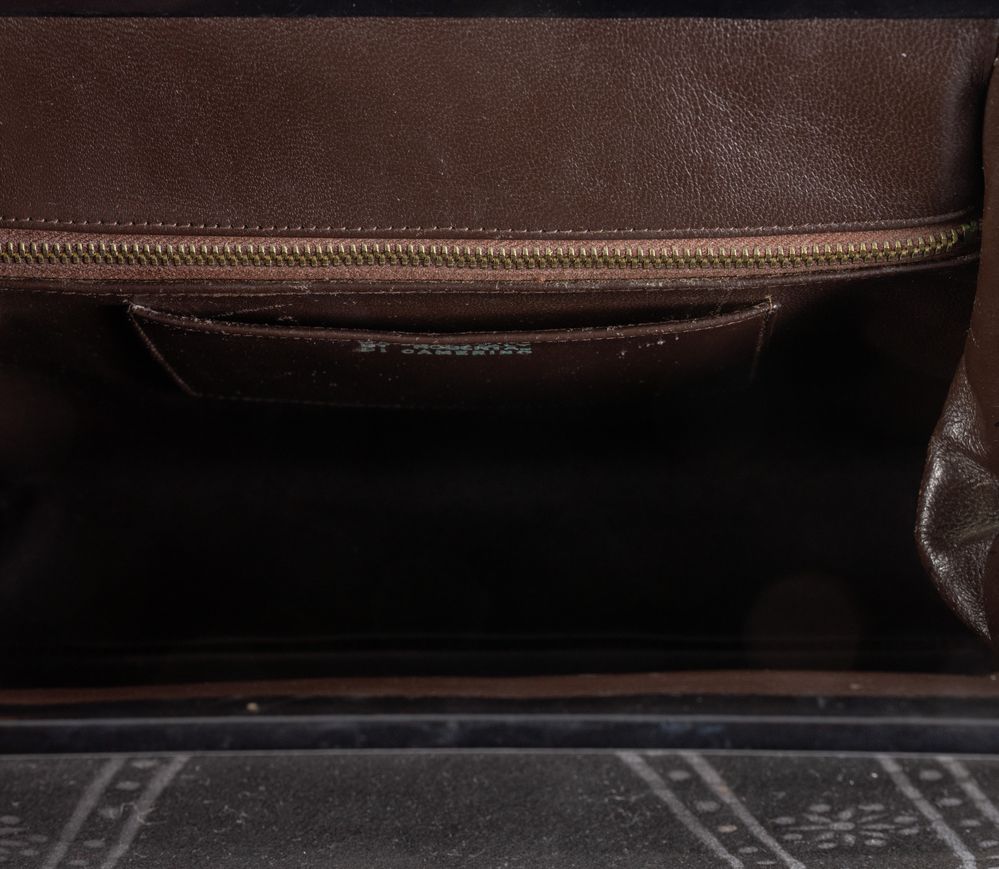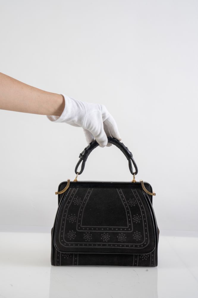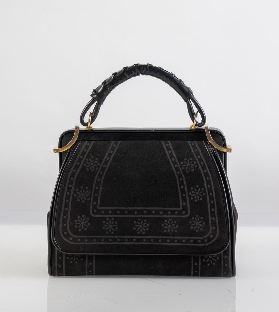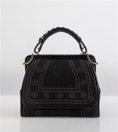 ROBERTA DI CAMERINO Borsa a mano in pelle scamosciata nera con ricami. Cm 20x24,5x10; altezza con manico cm 32. Dettagli in metallo dorato. Manico in pelle nera. Sul fronte reca tasca. All'interno reca tre tasche. Reca marchio Made in Italy By Roberta Di Camerino. (lievissimi difetti)