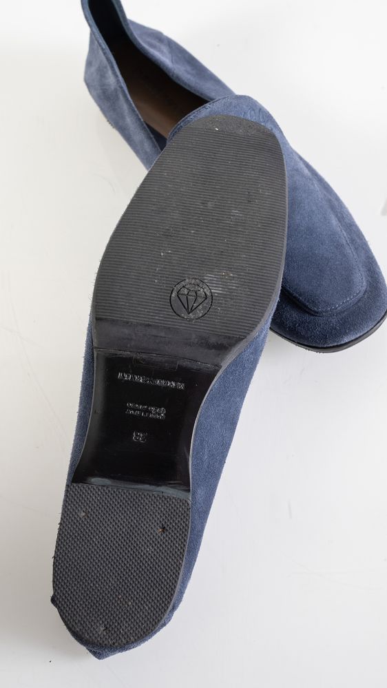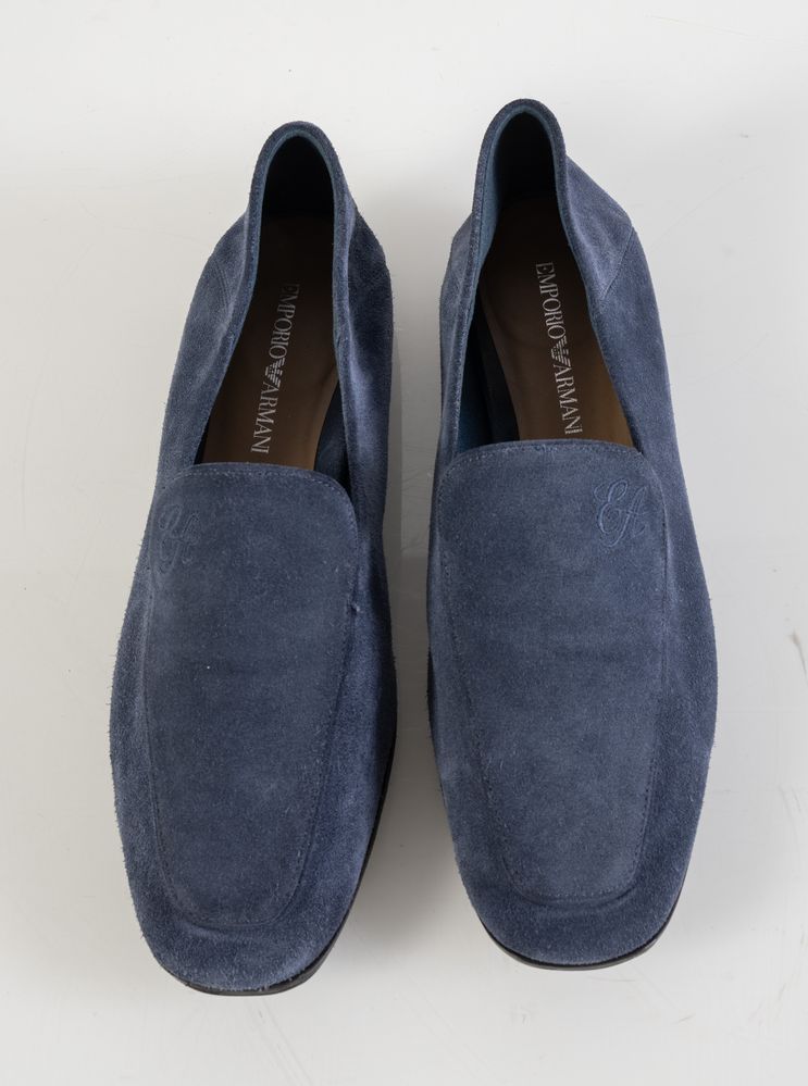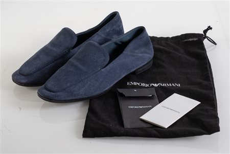 EMPORIO ARMANI Mocassini in pelle di vitello scamosciata blu modello Icon. Collezione attuale. Taglia 38. Recano marchi EA, Emporio Armani, codice di riferimento prodotto e cartellino di autenticità. Corredate da dustbag.