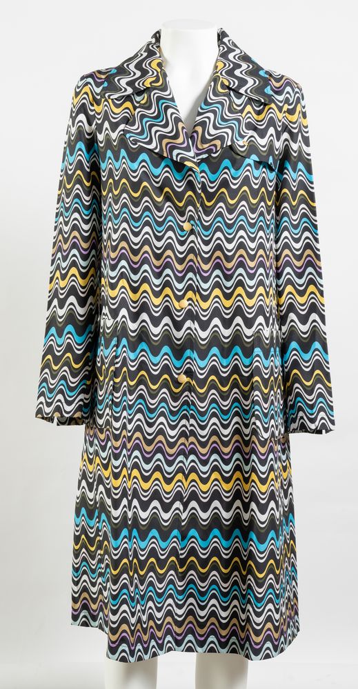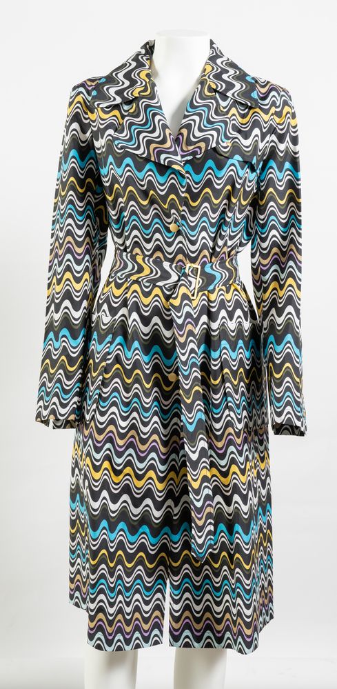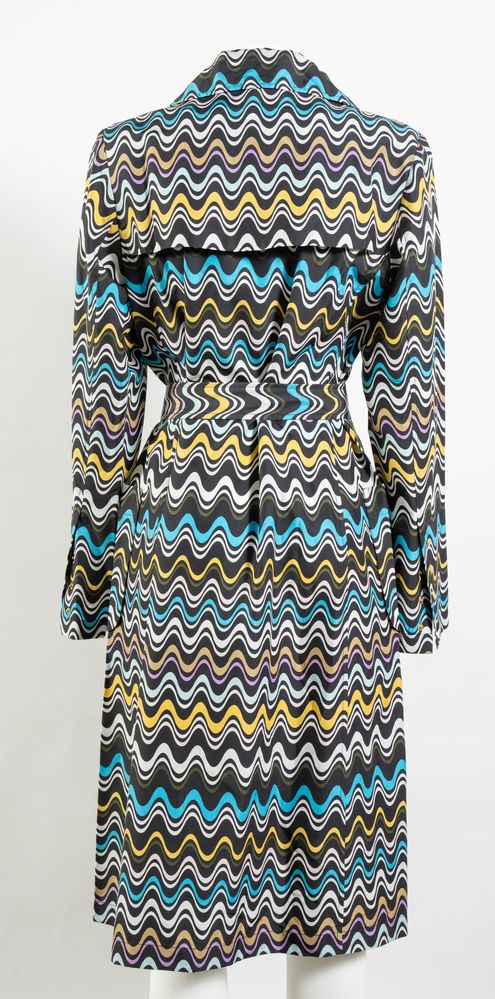 MISSONI Trench in seta a fantasia Zig Zag sui toni del nero, bianco, azzurro, giallo, verde e viola. Taglia IT 44. Composizione 100% seta. Dettagli in metallo dorato. Cintura removibile. Reca etichetta e cartellino Missoni