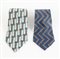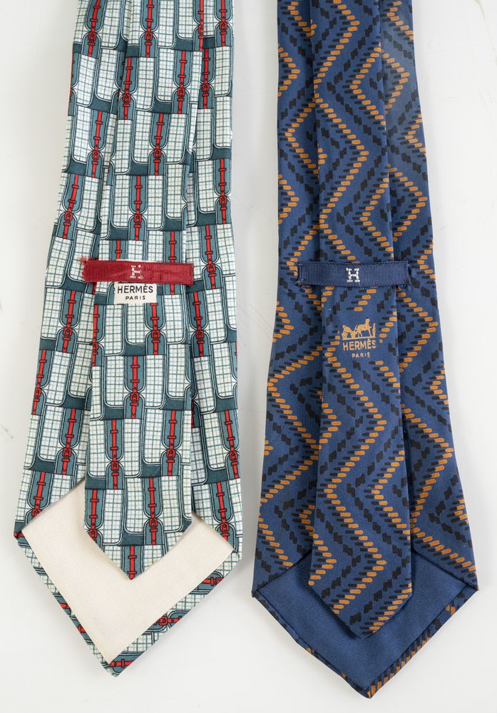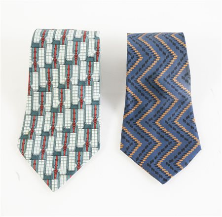 HERMÈS Lotto composto da due cravatte in seta a fantasia. Una a fantasia sui toni del verde, bianco e rosso. L'altra a fantasia sui toni del blu, nero e ocra. Cadauna di cm 150. Composizione 100% seta. Cadauna reca etichetta H e marchi Hermès Paris, Made in France.